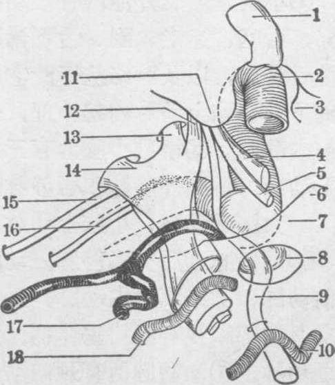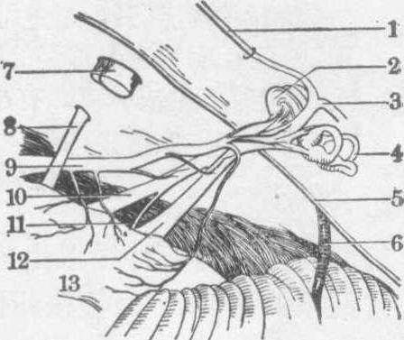 图4 桥小脑角上观图 1. 岩大浅神经 2. 耳蜗3. 面神经膝部 4. 半规管 5. 小脑幕附着线 6.岩静脉 7. 三叉神经 8.外展神经 9. 小脑前下动脉 10. 面神经 11.中间神经 12. 听神经 13. 桥脑 颈静脉孔和有关结构: 颈静脉孔由两部分组成。后外部分称静脉部,有颈静脉球、迷走与副神经和脑膜后动脉通过; 前内部分称神经部,有岩下窦和舌咽神经通过。这两部有纤维桥相隔,有26%的纤维桥呈骨化。覆盖在颈静脉孔上的硬脑膜形成两个孔道: 一个称舌咽道,在神经部内,有舌咽神经通过; 另一个称迷走道,在静脉部内,有迷走神经通过。此二道由硬脑膜构成的隔膜分开,相距0.5~4.9mm。硬脑膜在二道的前外缘呈唇状突起,向后内方伸出,盖在道内的神经上,犹如内听道口的外缘。舌咽神经根由延髓上端发出; 发出点位于面神经根的尾侧,橄榄核背侧2~4mm,第四脑室侧孔的腹侧; 此根的颅内段长15~21(平均17.6) mm,由一个感觉根和一个运动根组成; 前者位于背侧(较粗),后者位于腹侧,两者在舌