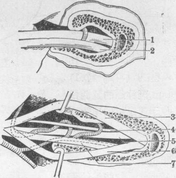 图5 内听道内神经 1,3. 前庭上神经 2,6. 前庭下神经 4. 中间神经 5. 面神经7. 耳蜗神经