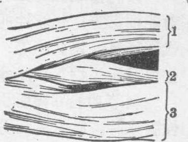 图3 右侧三叉神经根 1.小根(运动根) 2.中间根 3. 大根(感觉根)分 内听道和有关的神经与血管: 内听道内有五根神经,即: 面、前庭上、前庭下、耳蜗和中间神经,它们都从桥脑发出,经桥脑侧池进入内听道。在内听道的外侧段,这五根神经的位置较有规律。内听道的外端由横嵴分为上、下两部,每部分各有小孔两个。面神经和前庭上神经进入上部的两孔,面神经在前称面神经管,前庭上神经在后,二者又由一纵嵴分隔。耳蜗神经和前庭下神经别进入下部的二小孔,耳蜗在前称螺旋孔束,前庭下神经在后。中间神经则位于面神经与前庭神经之间。面神经进入面神经管数毫米后,就形成膝状神经节,再转向后,在外侧半规管后下方,下行于中耳的后壁,出茎乳孔到达面部。从膝状神经节有岩大浅神经分出前行,经面神经管裂孔穿出岩骨到达中颅窝底。在大多数场合,膝状神经节、邻近的面神经以及岩大浅神经近端,由薄层骨质覆盖。但有15%的覆盖骨质部分或全部缺失,致使上述结构暴露于中颅窝底,与硬脑膜邻接。前庭上神经进入内听道上部的小孔后分布于球囊、椭圆囊和上、外半规管。前庭下神经进入内听道底小孔后,分布于球囊和后半规管。耳蜗神经进入螺旋孔束后,分布于耳蜗(图4)。中间神经是面神经的感觉根,其解剖途径分为三部:起始段为听神经的一部分,长0~19(平均8)mm; 中间段为游离的神经,长1~18 (平均10)mm,位于前庭上神经的前方; 第三段与面神经合并,在面神经到达内听道底之前,长1~11(平均5)mm(图5)。上述诸神经的动脉供血来自小脑前下动脉的分支。面、听神经和迷路均由独立的动脉供血,各在桥脑侧池或内听道内从小脑前下动脉分出,相互间无侧支吻合。小脑前下动脉末梢部分有时先入内听道,然后再返回到桥脑侧池,给桥脑供血。