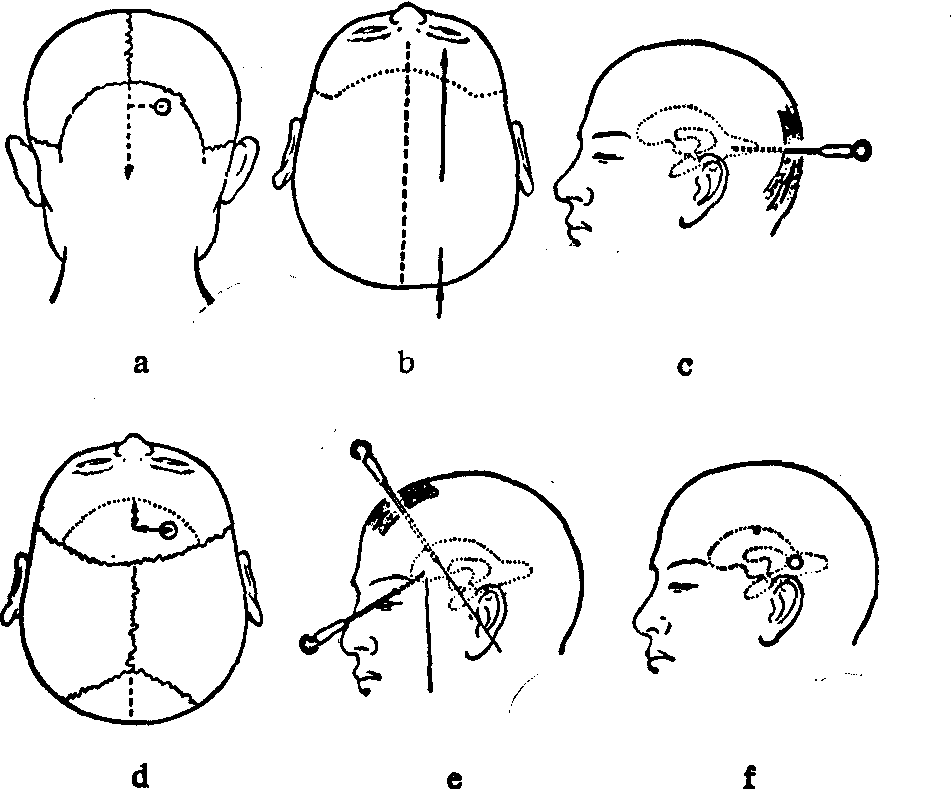 ❹经前囟法适用于前囟未闭的婴儿。经前囟穿刺侧脑室,其穿刺方向与前入法相同(图2)。前囟穿刺在婴儿可以测压及脑室造影,诊断有无阻塞性脑积水。经前囟刺入硬膜下腔(一般深度在1cm左右),可诊断及治疗婴儿硬膜下血肿、积液或积脓等。