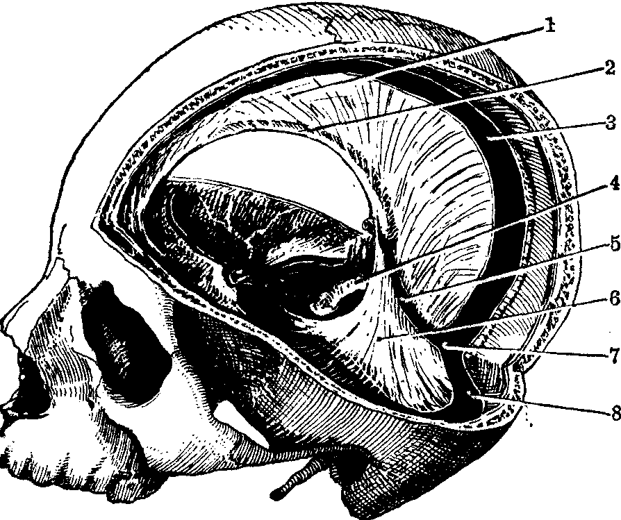 图2 硬脑膜及静脉窦 (部分打开颅盖骨,自左上方显示)