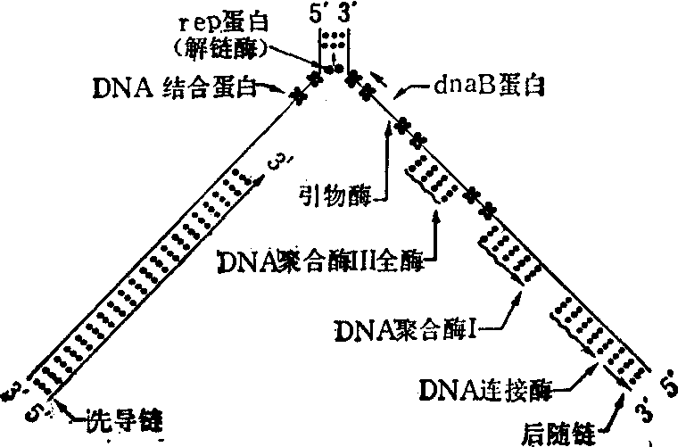 大肠杆菌DNA复制叉上的酶作用,右边的酶催化DNA合成的起始、延长和连接。