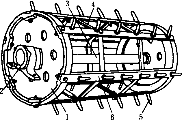图4 叶轮式脱粒装置 1.喂入口;2.脱粒叶轮;3.凹板筛;4.推送滚筒;5.滚筒刀片; 6.外壳 手持式弓齿滚筒脱粒装置 用手握持禾把进行脱粒的半喂入脱粒装置。其弓齿式脱粒元件对作物起梳刷作用辅以冲击而脱下籽粒,适用于茎秆整齐、穗头一致的稻麦类作物。 人力打稻机上的脱粒装置只有一个脱粒滚筒,没有凹板配合作用。弓齿或板刀齿按螺旋线排列在滚筒表面。滚筒分开式和闭式两种。在稻麦两用的机动打稻机上,为了适应小麦容易出现断穗的脱粒特性,加强断穗处理能力,常在滚筒的前方装一块斜挡板,使它能返回脱粒间隙进行复脱。滚筒的下方装编织筛式凹板。 夹持式弓齿滚筒脱粒装置 由夹持输送器夹紧作物茎秆基部边输送边脱粒的半喂入脱粒装置。适用于脱水稻和麦类作物,广泛应用在半喂入的脱粒机和联合收割机上。脱粒装置由夹持输送器、弓齿滚筒、凹板和副滚筒组成。夹持输送器由链条和夹持台组成。滚筒(图5)表面装有按螺旋线排列的弓齿。弓齿分脱粒齿、加强齿、第一梳整齿、第二械整齿、第三梳整齿和内齿,滚筒的喂入口一端,由一段截锥体和圆柱体相连接,截锥体上固定着强度较大的梳整齿,圆柱体上装有加强齿和脱粒齿,出口端装有击禾板,促使碎草迅速排出脱粒室。闭式滚筒配编织筛式凹板,开式滚筒配栅格凹板。滚筒盖内侧装有导向板。副滚筒上的弓齿矮而粗壮。