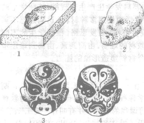 在课堂教学中,将中国传统戏曲特有的艺术形式——脸谱的知识和描绘方法教给学生,让学生在纸张上或半立体的石膏、泥制的脸型或蛋壳上描绘脸谱。脸谱既是戏剧化妆方法,又是一种独特的狞厉美的表现形式。我国的戏剧脸谱流派很多,从类别看有整脸(如关公、曹操)、三块瓦(如姜维)、花三块瓦 (如窦尔墩)、六分脸 (如黄盖)、十字门脸(如张飞)、象形脸 (如孙悟空)、神仙脸(如二郎神)等,从色彩来看用红黑色代表忠、用白色代表奸、用蓝绿色代表草莽英雄、用金银色代表神怪等。在教学生在纸上描绘脸谱时,要先让学生用对折剪纸方法剪一个正面脸形,用这个脸形为样板,在纸上画几个同样的脸形,然后在这几个脸形轮廓中起稿着色,脸谱的着色顺序是先画黑色,眼窝、眉毛、胡囊,再画面颊、额头的主色,在面色与眉眼的接缝处,常留一条白线,使各部位结构分明。在描绘石膏脸型时应先刷一层水胶,防止大量渗色,在描绘泥制脸形时要在泥表面涂两层广告白色以便绘色,在描绘蛋壳脸谱时,要将蛋壳表面用细沙纸磨一下,以防蛋壳有油性不挂色。立体脸谱画好后,把黑红色部位涂清漆上光,不要满涂清漆。脸谱教学中,除临摹传统戏剧脸谱外,也可以让学生自己设计、描绘脸谱,如以花形盖面的“花神”、以飞机形盖脸的“空军司令”等无谱的怪脸,脸谱创作可促进学生想象力的发展。