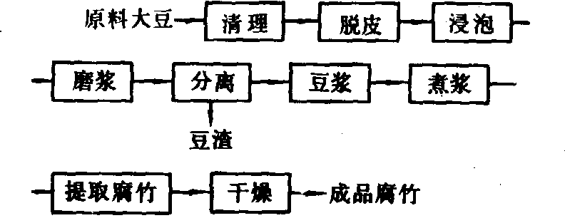 腐竹加工fuzhu processing豆浆加热处理时,将漂浮在表面凝聚成大豆蛋白和脂类的胶状薄膜捞出进行干燥的过程。形状像竹笋,所以叫腐竹,又称腐皮、腐衣、豆腐棍等,是一种营养丰富的高蛋白豆制品。腐竹大约含蛋白质51%,脂肪21%,还含有人体必需的钙、磷、铁等多种矿物元素。 腐竹加工的基本原理是当豆浆升温时,其中的蛋白质、脂肪、糖分的微粒,在水分子的碰撞下作无规则运动,引起蛋白质胶体微粒间的碰撞和粘接,表面水分大量蒸发,使豆浆表面形成一层蛋白质薄膜,即腐竹皮。腐竹生产的工艺流程见图。腐竹生产关键步骤是制浆,煮浆,起皮及腐竹干燥。起皮以前的加工工艺与生产设备,同豆腐加工。 将煮熟的豆浆输送到腐竹锅内制取腐竹皮,此时应保持豆浆温度在82℃左右。豆浆表面结皮厚度达到约0.6毫米,即可用竹棍手工挑取腐竹皮。每隔8~10分钟挑一层,当挑起腐竹皮达到一定次数时,腐竹锅内所剩豆浆中糖分及其他干物质含量增加,而蛋白质含量减少,豆浆表面不再形成腐竹皮,此时可将所剩豆浆及锅巴从锅内铲出进行过滤,再将滤出的浆刷制成厚度约0.8毫米的甜片(甜竹)。
