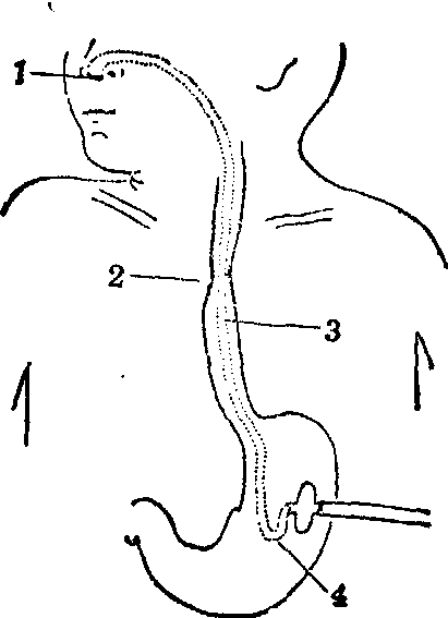 ❷以细塑料管通过鼻孔至咽部引导硅胶线之一端从鼻孔拉出,绕过鼻小柱前方反回咽部,再随输尿管导管拉回至胃造口(图),因而硅胶线之两端均在胃造口外,以备连接扩张探条用。(3) 食管狭窄的晚期治疗: 长期扩张无效者施行代食管改道手术,即在狭窄近端与胃底间以代食管连接,不切除周围有广泛粘连之狭窄段。代食管可用部分结肠、胃管或空肠,但以结肠较好。