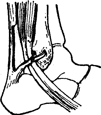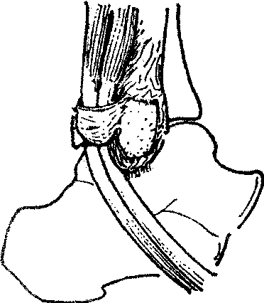 本症发生于当足处于轻度内翻位,受到突然强力背屈之外力时,引起腓骨肌猛烈地反射性收缩,腓骨肌腱冲破上支持带的限制或外踝后沟外侧缘发生撕脱骨折后,腓骨肌腱即滑向外踝的前方。急性损伤后之上支持带或外踝撕脱骨折未能愈合,则形成习惯性腓骨肌肌腱滑脱。外踝后沟和腓骨肌上支持带解剖上的变异,可以减弱对腓骨肌腱的限制作用,而易于滑脱。