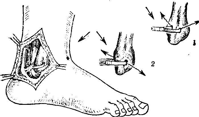 新伤应以石膏固定4~5周。慢性者应手术治疗。术式较多,Watson Jones法较好(见图1)。如用Ellis Jones法应予改良,腱应由腓骨沟穿入固定,而且不应拉得太紧,否则踝背伸受限,影响运动技术(见图2)。