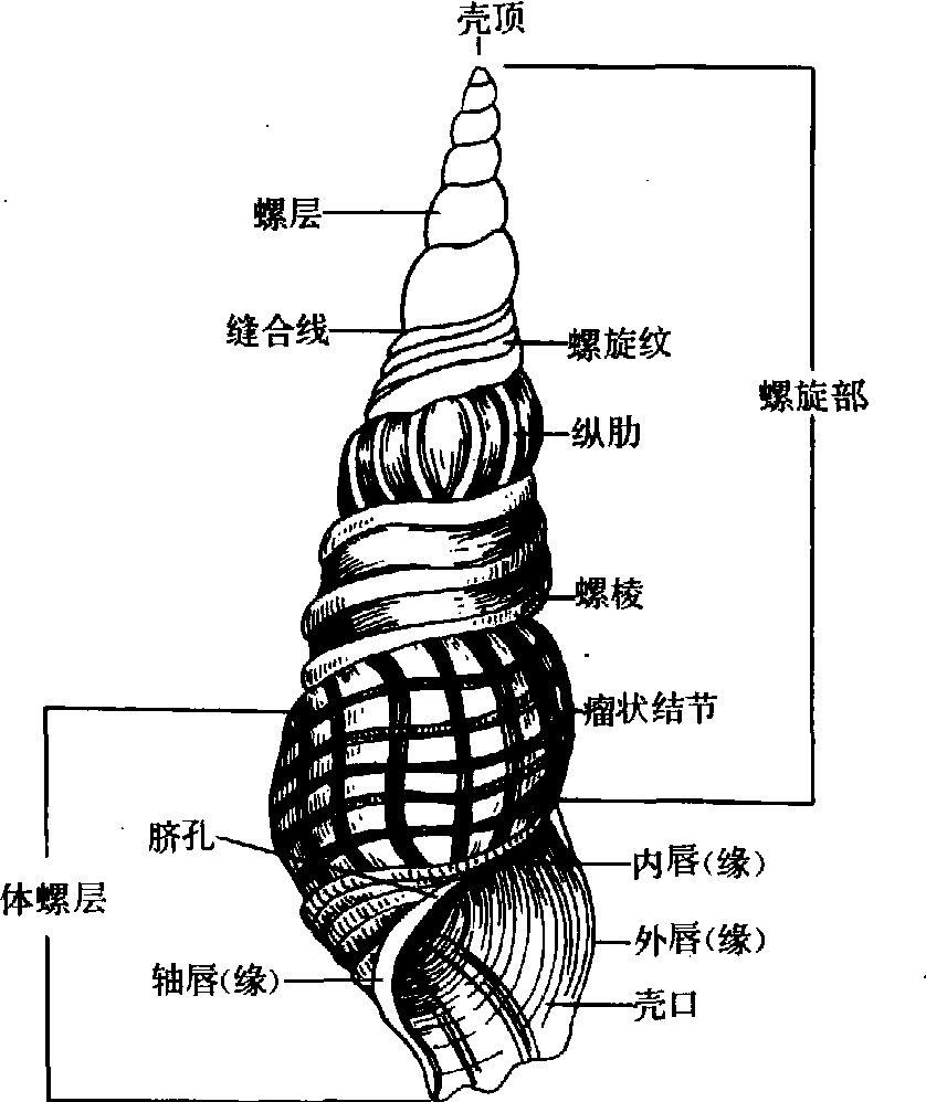 腹足类贝壳的各部名称 生态 多数自由生活,少数寄生。分布于陆地、淡水、海洋中。淡水产的生活于河流、沼泽、稻田等地。如圆田螺、扁卷螺等; 少数生活于山间急流或350m深的湖底。 海产种类多在温带、热带、亚热带海水中,从高潮线到5 000m深海均有。中国的渤海、黄海、东海和南海等海域软体动物极其丰富,多在岩石、潮下带及深海底生活。棒槌螺可在珊瑚礁间的沙滩上爬行。 陆生种类如蜗牛等,分布于平原、田野、森林、高山等地。褐云玛瑙螺可生活在菜园、有荫蔽的处所或爬到灌木上。冬天或气候干燥时,可分泌粘液封闭壳口,春、夏、秋季都较活跃。多数以藻类、浮游生物等为食,食植性的蜗牛可用齿舌刮食叶面的柔软组织,肉食性的玉螺则用吻捕食小型动物。 繁殖方式复杂,卵生或卵胎生。繁殖季节因种类而异,如螺蛳终年均可繁殖。有些海产种类如海兔在春、秋两季繁殖。 重要种类 ❶中国圆田螺(Cipangopaludina chi-nensis): 淡水中常见的大型螺类。贝壳大,薄而坚固,呈圆锥形。壳面光滑,有细密的生长线呈黄或绿褐色。有6~7个螺层。体螺层膨大。壳口卵圆形,有角质厣。生活于湖泊、池塘等地。繁殖季节在4~8月; 生长一年即达性成熟。广泛分布于中国南北各省。肉可食、可作为鱼类和禽、畜的饲料,也可入药。 ❷湖北钉螺(Oncomelania hubensis): 贝壳小,壳质厚而坚固,外形呈削尖圆锥形。有6~9个螺层。壳面淡灰色有纵肋,壳口卵圆形,周缘完整,有黑色框边,角质厣为黄褐色薄片,有螺旋形生长纹。生活于平原、湖泊、池塘等处。一年四季皆可繁殖。卵一般在16~23℃孵化约需20~28天,两个多月即可发育成熟。分布于中国安徽、江苏、浙江、江西、湖北、湖南、广西、广东、上海等地。是严重为害人、畜健康的日本血吸虫的中间宿主。 ❸耳萝卜螺(Radix auricularia): 贝壳较大,壳质薄,略透明,外形呈耳状。有4个螺层。螺旋部极短,体螺层极大。壳面黄褐色或赤褐色,生长纹明显。壳口大,呈耳状,半圆形。栖息于池塘、湖泊、水库、小溪内。雌雄同体,异体受精。以硅藻和水生植物为食。分布中国各地。可作鱼类、禽类饲料。它是危害牛、羊等的肝片吸虫及其他吸虫的中间宿主。黄蛞蝓(Limax flavus): 身体裸露而柔软,无外壳。头部2对触角。体背前端1/3处有一椭圆形的外套膜,内有一石灰质板(退化的贝壳)。体黄褐色、深橙色或浅黄斑点。有角质齿舌,约150列齿。栖息于阴暗潮湿的温室、菜窖、住宅附近,农田等多腐殖质的石块、落叶下。分布中国南北各地。为世界性广泛分布种类。 经济意义 鲍干、贻贝、田螺、榧螺等营养价值高,均可食用。鲍的贝壳称“石决明”可以入药。海兔卵群可止鼻血、解热等药用。宝贝、凤螺等色彩鲜艳美丽,可做装饰品。许多螺肉可作鱼类,禽畜的饵料及饲料。贝壳可作肥料。玉螺、三角荔枝螺可危害牡蛎、贻贝的养殖,影响生产,如椎实螺等是人、畜及鱼类寄生虫的中间宿主,传播疾病,各种蜗牛、蛞蝓为害蔬菜、棉、麻、烟草等作物,是农林、园艺上的害虫,有的甚至进入住宅、厨房,造成污染,严重影响卫生。 腹足纲Gastropoda软体动物门的一纲。头部发达,有眼和触角。腹面有肥厚宽广的肉足,故名。内脏团和贝壳因发育过程中发生扭转,呈不对称状。贝壳若有,仅为一枚,多呈螺旋状,如田螺、螺蛳、钉螺、豆螺、蜗牛等;或缺如,如海兔、蛞蝓。种类繁多,仅次于昆虫纲,为动物界的第二大纲。分布广,水陆均产。与人类关系密切,有的种类可食,经济价值很高,如红螺、鲍、蜗牛等;有的为人畜寄生虫的中间宿主,如钉螺、椎实螺等。 腹足纲 腹足纲fuzugangGastropoda无脊椎动物,软体动物门中种类最多的1个大纲。全世界近9万种,数目仅次于昆虫纲。分布很广,遍及全世界的海洋、淡水和陆地。多数种类营自由生活,仅少数种类营寄生生活。其中海产种类最多,淡水种类次之(约有12000种),陆生种类较为稀少。足发达,宽平肥厚,位于腹部,故称腹足纲。又因多数种类仅具有1个螺旋式贝壳,故又称单壳纲(Univalvia)。头部和足左右对称,内脏团在发生期间经过 “扭转”而演变成左右不对称的体制,贝壳也相应发生卷曲而形成左右不对称的螺旋形,如田螺、红螺,这样既可保持原有容积,减少贝壳的长度,又可增加运动的灵活性。有的种类由于贝壳退化,内脏团又发生 “反扭转”现象,体制重新表现为左右对称,但内脏团仍为左右不对称。贝壳由外套膜的表皮分泌形成,多数种类呈右旋螺形,即壳口的位置在螺轴的右侧,如从贝壳的顶端观察,则见顺着时针的方向旋转。少数种类为左旋,如部分蜗牛;极个别的种类如椎实螺,左旋和右旋的都有; 还有少数种类的贝壳无螺旋部,近似圆形或椭圆形,如笠贝(Acmaea);个别种类的贝壳退化或消失,如蛞蝓、海兔。一般无厣或有膜厣,有的种类具有与壳口形状、大小相同的角质厣(足腺分泌),如田螺。头部发达,具有1~2对触角和眼等感觉器。口腔内具有发达的齿舌。内脏器官一侧退化,鳃、心耳、肾一般为单一的; 水生种类多用鳃呼吸(淡水椎实螺例外),陆生种类多用肺(变态的外套膜)呼吸。海产种类多为雌雄异体,间接发育(有幼虫期);淡水种类多为雌雄同体,直接发育,但田螺为卵胎生。依身体结构不同,可分前鳃亚纲(Prosobranchia),鳃位于心室前方,如鲍、宝贝、芋螺、红 螺、田 螺、钉 螺 等; 后 鳃 亚 纲(Opisthobranchia),鳃