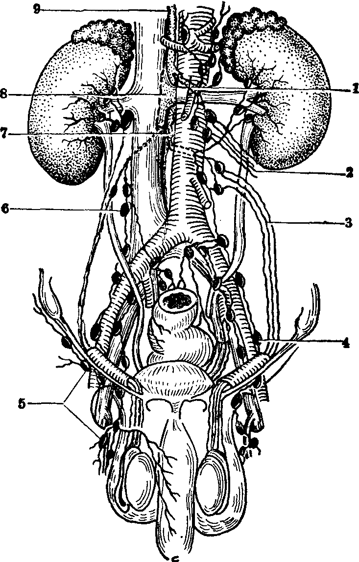 1.肠干 2.肠淋巴管 3.睾丸淋巴管 4.髂外淋巴结 5.腹股沟淋巴结 6. 腰淋巴结 7.腰干 8. 乳糜池 9. 胸导管