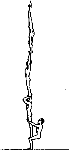 男四项目第1套静力性造型动作之一。属一人打底的立柱造型。俗称“马步立柱倒立造型”。“下”半蹲分腿站立,“中1”站其腿上,“中2”站“中1”肩上组成立柱架,“上”在“中2”手、头等部位做各种倒立动作。这种造型由于“下”马步站立,重心较低,难度一般,适合少年运动员练习。完成方法:由“中1”与“下”前后同向站立,“下”两手扶“中1”腰部向上托起站于马步腿上;“中2”面对“下”站立,两臂上举,“中1”半蹲,与其交叉握,“中2”在“中1”助力下向上跳转180°站“中1”肩上组成立柱架;“上”面向站于架前,两臂上举,与“中2”交叉握在“中2”协助下用力向上跳转180°,站“中2”肩上;“上”在“中2”手、头等部位完成各种倒立。动作完成后,“上”、“中2”、“中1”依次向前跳下。练习方法:上3节立柱倒立配合练习;四人组架练习;完整练习。