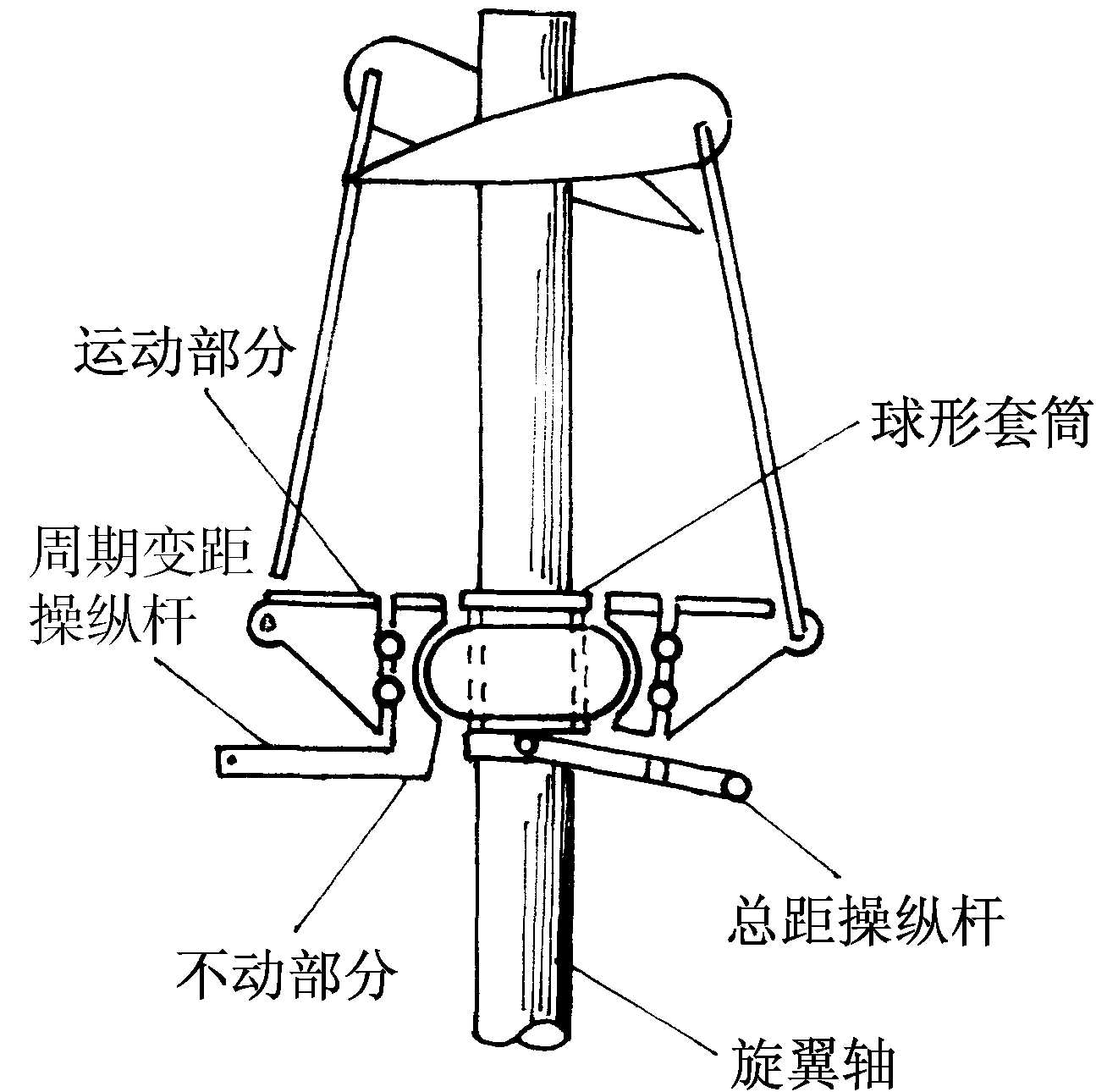 直升机改变旋翼倾斜方向和桨叶倾角的专用装置。通过它实现对直升机飞行状态的操纵。它经由球形套筒装在旋翼轴上,套筒和总距操纵杆相连并可在旋翼轴上下滑动。套筒的球面上套有一个不旋转的环,称为内环,和周期变距操纵杆相连。内环可沿球形套筒向任一方向倾斜,外环是旋转部分,通过滚动轴承绕内环旋转,同时通过拉杆与桨叶连接并一同运动。操纵总距操纵杆时,球形套筒带动整个自动倾斜器向上或向下,使各个叶片的桨距同时变大或变小,使直升机上升或下降。推动周期变距操纵杆时,使内环绕套筒倾斜,带动外环倾斜,拉动桨叶周期性地改变桨距,使旋翼旋转平面倾斜,从而使直升机沿着旋翼拉力水平分量的方向飞行,达到控制直升机飞行方向的目的。