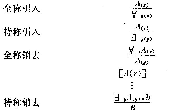 图式横线上的公式为推演的根据,横线下的公式是结论。横线上面有方括号的公式,例如[A],只是暂时的假设,推理图式中的结沦不再以它为前提。因此,自然推理在证明的任何一步上,都可以引入前提,并且在证明的任何一步上所得到的结论都可以作为后继证明的前提。 关于量词的推理图式如下: ![]() 在全称引入图式中的变项x不得在曾经引用本图式的任一被解除公式中作为自由变项出现。 通过上面的图式就可以进行定理的证明。如果证明序列中的每一步都是由推理规则或推理图式得到,则这样的证明称作有效的。有效证明得到的结论称作有效的结论,即该结论是从前提中必然得出的。解除了假设前提而得到的公式都是系统中的定理。自然推理系统满足完全性的要求,即它能把命题逻辑的所有重言式和谓词逻辑的所有普遍有效式都推演出来。 ☚ 公理系统 元逻辑 ☛ |
