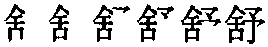 ❹ 旌旗卷舒 舒 金文; 篆shū[予(意符)+ 舍(聲符)→ 舒(《説文》:“舒,伸也。從舍,從予,予亦聲。一曰:舒,緩也。”舒,從樹上巢居到地面舍居,自然感到寬敞和輕鬆〈舒服〉。把自己多餘的房舍讓給旅人住宿,旅人當然感到舒適。引申爲伸展〈舒展〉,寬解〈舒經活血、心情舒暢〉。姓,舒同,書法家。)] [春秋] 曾參《大學·第十章》:“生財有大道,生之者衆,食之者寡,爲之者疾,用之者舒,則財恒足矣。”(至於生产財物,也有一條光明大道,那就是生产的人多,消耗的人少,製造的人快,使用的人不浪費而寬舒,那麼財富就多了。) 舒shū(12画)