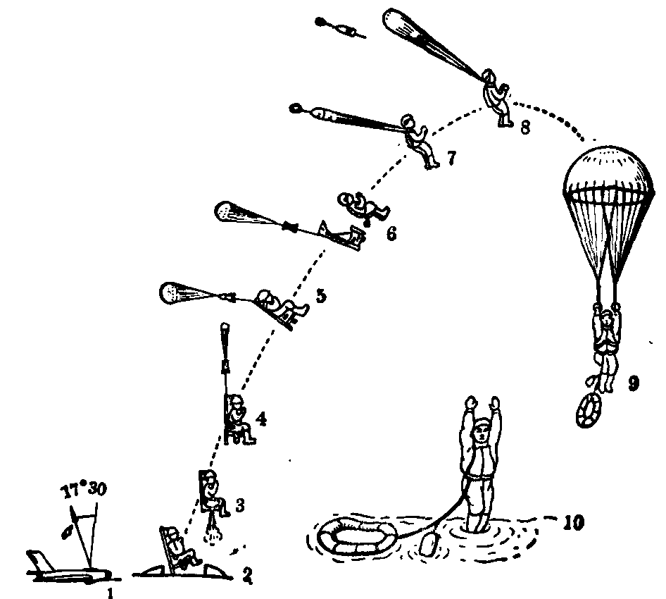 图2 弹射离机基本过程 1. 抛盖 2. 弹射弹打火 3. 火箭包点火 4. 射出稳定伞 5. 稳定减速 6.人椅分离 7. 拉出主伞 8. 主伞充气,到达最高点 9. 稳定下降 10.着海(陆) 弹射离机方案 1939年,德国开始研究弹射救生技术。1944年作为救生手段正式在飞机上使用。五十年代以前,基本上采用弹道式弹射座椅。六十年代以后,为了解决低空救生问题而发展了火箭式弹射座椅。针对不同机种的要求,目前已发展了以下几种弹射离机方案。 弹道式弹射座椅 分向上弹射和向下弹射两种。其结构是在弹射座椅背面装有弹射筒,筒分内、外两个。向上弹射座椅的内筒联接在座椅骨架的顶端,外筒固定在飞机座舱的底板上。操纵打火机构时,内筒的弹射弹点燃,借助筒内强大内压,将座椅和人一起弹出座舱。后为提高弹射初速,弹射筒由原来的两节发展为三节、四节套筒,弹射弹由原来的一个改用一个主弹射弹加一个或两个辅助弹。座椅上有的安装了自动程序控制机构。弹道式弹射座椅经过不断改进,在五十年代已普遍使用,其弹射救生成功率可达80%以上。 火箭式弹射座椅 在座椅上加装火箭助推器,即在弹射时首先利用弹射弹将座椅弹出座舱,紧接着点燃火箭助推器使座椅继续升高,这样可以增加弹射轨迹的高度,改善低空救生性能。火箭弹射座椅有三种类型: ❶与弹道弹射装置合在一起的火箭弹射器,如美国研制的ACES火箭弹射座椅; ❷双弹射筒双火箭型式的组合动力装置,如美国研制的SⅢS-3火箭弹射座椅; ❸除椅背有弹射筒外,在椅盆底下加装一个火箭包,如英国研制的MK-10火箭弹射座椅。目前火箭式弹射座椅已为各国所广泛采用,有的已具有可在零高度、零速度和1100km/h速度条件下安全救生的先进性能。 CK系统弹射座椅 为苏联米格-21飞机装备的弹射座椅。弹射时,飞机座舱盖会自动扣合在座椅上,为防止高速气流直接作用于人体,离机后达到一定高度时先自动抛掉舱盖,再进行人、椅分离,张开主伞、着陆。此系统因低空性能太差已为敞开式火箭弹射座椅所取代。 B型弹射座椅 弹射时,弹射座椅的脚蹬首先向上翘起,然后座椅向后旋转90度,椅盆向前,座椅呈水平位弹出。利用座椅盆底保护飞行人员不受高速气流伤害。这种座椅实际上很少被采用,仅美国F-106飞机曾装备过。 救生囊 是一种带有折叠罩的封闭式囊形座椅。常规飞行时,罩子折叠在座椅上端;当座舱被破坏或不能增压时,即可激发座椅封闭系统,使折叠罩自动从座椅顶上转下,使救生囊处于封闭状态。这时,相当于在飞机座舱内部又安装了一个小舱,能给飞行人员提供较好的环境保护。若不需要立即弹射离机,还可以使囊内增压,并从封闭罩上的小窗观察仪表。再作短时间飞行。需要弹射离机时则利用火箭将救生囊弹出。弹出后稳定伞立即打开保持稳定,到4500m以下张开回收伞,救生囊整舱着陆。美国的B-58和B-70两种超音速轰炸机均采用这种弹射装置。但这种装置低空救生性能不好,故未获得广泛采用。 分离式救生舱 将飞机座舱作为救生舱。应急离机时飞行人员起动弹射手柄,线状炸药绕着分离舱的周边爆炸,以切断救生舱与机身的连结,然后,分离的救生舱由火箭发动机推动离开机身,最后用回收伞将整个舱体回收。美国F-111飞机采用分离式救生舱,此种救生舱虽在高速弹射时可提供良好的环境防护,但由于舱体目标大,在实战中若救生舱本身受到损坏,飞行人员的安全就会直接受到威胁。 飞行弹射座椅和热气球救生系统 这是为飞行人员在弹射离机后仍可有目的地选择着陆点而研制的弹射救生系统。飞行弹射座椅是一种装有推进发动机和升力装置的弹射座椅。弹射后飞行人员可以继续象操纵一架单人飞行器一样,在一定区域内以一定速度控制座椅,按所需的方向飞去,然后再行人、椅分离,最后乘降落伞着陆。美国已进行大量工作,提出过旋翼、伞翼、帆翼和刚翼等四种飞行座椅方案,但尚未见应用。热气球救生系统,为在原弹射座椅上增加一个气球和辅助充气装置,可使飞行人员在空中悬留30分钟,待营救飞机前来拖曳营救。 牵引式救生系统 该系统利用一个旋转火箭,可从发生紧急故障的飞机上将飞行人员牵引出座舱 (座椅仍然留在飞机上),待达到一定高度,打开降落伞安全着陆。美国于1966年开始研制,主要解决A-1、T-28等低速活塞式螺旋桨飞机的救生问题,因这类旧式飞机座舱空间很小,不可能安装弹射座椅。从目前情况看,这种救生系统有可能解决零高度、零速度和速度为834km/h条件下的救生问题。美国空军已有不少活塞式发动机飞机和类似的攻击机装备了这种系统,并正在研究将该系统用于直升机的救生。直升机的弹射救生问题比较复杂,目前尚未圆满解决。有的主张在弹射前先将旋翼抛掉,有的则主张采用侧向或向下弹射。总之,牵引式救生系统结构简单、重量轻、占空间小、救生系统成功率高,具有解决运输机、旅客机和直升机的空中应急救生的潜力,是一种很有发展前途的救生系统。 弹射座椅设计要求 目前最广泛使用的仍是火箭式弹射座椅。关于现代高性能弹射座椅的设计要求涉及多方面问题,从航空医学角度,主要应考虑以下几点: (1) 必须确保安全可靠,操纵须高度自动化,关键部件应备有双套。因在弹射跳伞过程中,有些飞行人员可能发生—过性意识障碍或因负伤而昏迷,不能保持正常工作能力。高度自动化可