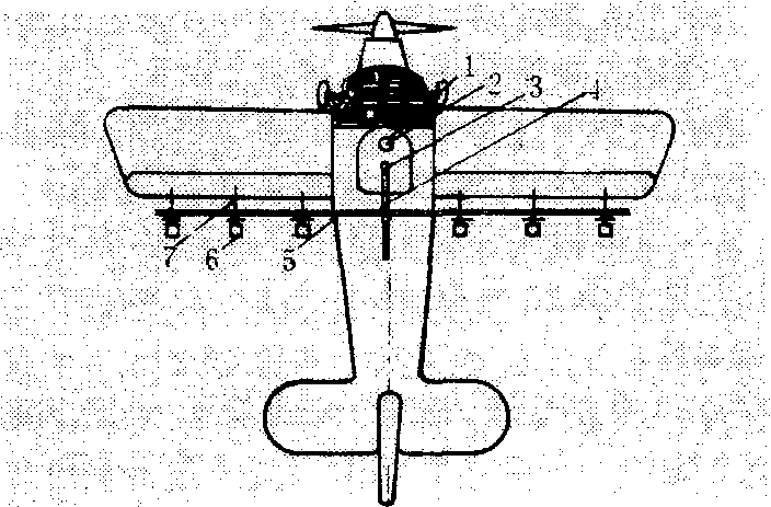 图1 飞机常量喷雾设备 (据郭奇宾) 1.加液口;2.加液管;3.药箱;4.喷雾管;5.喷雾控制阀;6.液泵;7.风车