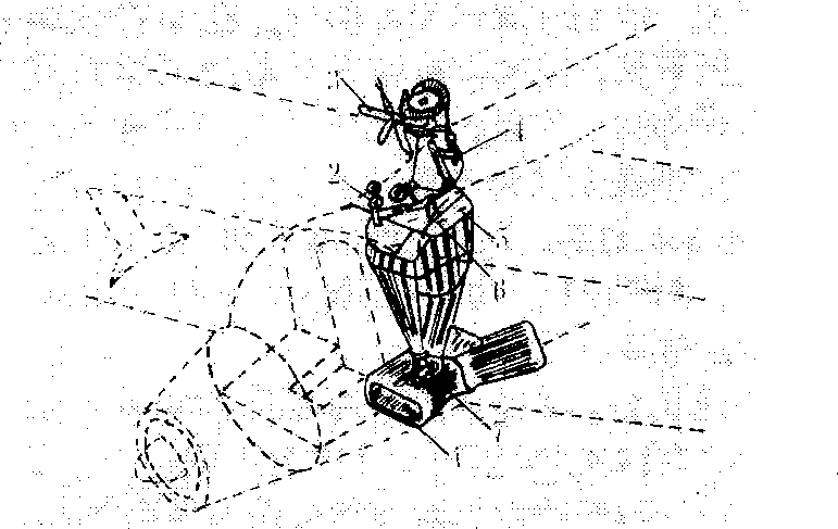 图2 飞机超低容量喷雾设备 (据郭奇宾) 1.药箱; 2.液泵; 3.控制阀;4.输液管; 5.支管; 6.雾化器; 7.支架 等组成。供液系统由药箱、液泵、控制阀、输液管道等组成,液剂、粉剂使用同一药箱装载,液泵由风车或电动机驱动。雾化部件由喷雾管与喷头组成,根据不同喷雾要求,可更换不同型号的喷头。飞行员在座舱内操纵喷雾控制阀即可实施喷雾。超低容量喷雾是一种工效很高的喷雾方式,与常量喷雾相比,其喷雾量很小、雾滴极细,可以直接喷洒未经稀释的农药原油。非常适合地域辽阔的大面积农场、牧场、林场喷洒农药。喷雾设备的雾化部件采用高速旋转的盘式或笼式雾化器,其他部件与常量喷雾设备大同小异。 喷粉设备 主要由粉箱、搅拌器、风洞扩散器、风车、定量粉门等组成(图3)。飞行员操纵定量粉门,粉箱内的药粉在搅拌器的推动下,通过粉门定量地进入风洞扩散器,在强大气流作用下,从扩散器后部喷撒出去。这种型式的喷粉设备还可用于喷撒化肥、颗粒农药以及撒播稻种、树种、草籽等。