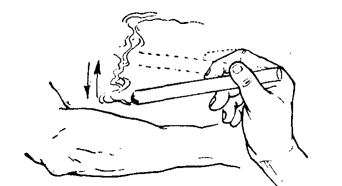 图2 温和灸 雀啄灸 以艾卷点燃端雀啄米样地熏烤穴位,忽高忽低,低者可使患者感觉灼痛,高者患者无明显感觉,一般灸5~10分钟。(图3) 熨热灸 也称巡回灸,多用于皮肤病的治疗,即在距离皮肤病疮面适当高度上巡回施灸,犹如熨烫衣服似的,直到皮肤病疮面上呈现红润为止。(图4)
