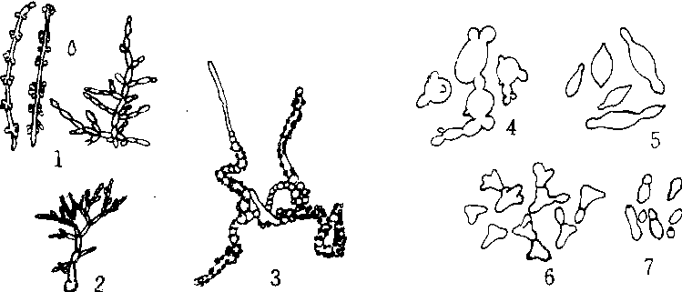 芽孢子及酵母的芽殖 1.假丝酵母的假菌丝和芽孢子 2.玉米黑粉菌冬孢子萌发后原菌丝形成的芽孢子 3. 总状毛霉在液体培养基内形成的酵母型细胞 4.多边芽殖 5. 两端芽殖 6. 三边芽殖 7. 一端芽殖(半裂殖) |