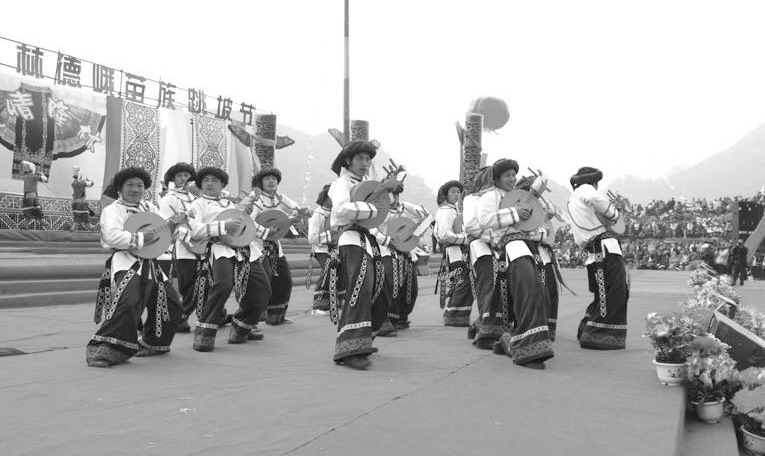 这一首古老的苗家山歌。叙说了玉翠和阿贵的爱情故事,与月琴起源,紧密相连。如今,苗家男青年几乎人人都弹月琴,不然,在喜庆之日的良宵月夜,将找不到心上的爱人。说起这月琴的来历,在广西隆林县德俄地区,流传着一个美妙、忠贞的爱情故事。 传说,过去在石山林立的德俄苗寨,有一对相好的青年。男的叫何阿贵,女的叫杨玉翠。阿贵是个勇敢的好猎手。他张弓,飞鸟别想躲过;他举枪,猛兽必定身亡;他挥刀,巨蟒挡不住他。玉翠是个聪明伶俐、活泼大方的姑娘。她心灵手巧,大大小小活几,无论粗细都拿得起、放得下。 在跳坡节里,他俩总是寸步不离的一对。玉翠给阿贵的箭袭阳扎的刀穗是姑娘们最艳羡的;阿贵给玉翠采来的山花和插在头上的金鸡羽毛是最惹小伙子们注目的。 苗王的儿子黑虎早就看上了玉翠。一有机会,他就胡搅蛮缠地死死缠住她。说不尽的甜言蜜语,献不完的虚情假意,玉翠硬是不答理。 黑虎撩不动玉翠就把怒气转向阿贵。他仗着自家的权势威胁阿贵,逼阿贵不准与玉翠相好,阿贵不干,黑虎就蛮横地提出要与阿贵比武。 比就比,阿贵的武艺是硬打硬的。 第二年夏历正月初九,跳坡会非常热闹。各村各寨的男女老少都赶来看黑虎和阿贵比试武艺。黑虎三箭射落百米外吊着的山鸡,阿贵一箭射落吊山鸡的绳子;黑虎三刀杀死大水牛,阿贵一刀宰下大牛头;黑虎三叉叉中野山猪,阿贵一叉叉死野猪王。 黑虎气急败坏,又提出在跳坡节这天的夜晚中比爬竿。豪爽刚强的阿贵决不示弱,再次答应。当晚,月儿圆圆,两根高高直的竖竿上端吊着白酒肉食。黑虎腰粗背阔,他虎视耽耽地紧盯着竿头的美味佳肴,一心想吞个痛快,可他拼老命爬到顶端时,早已气喘吁吁,酒肉还没沾口就跌了下来,摔个四脚朝天,好不狼狈。围观的姑娘一阵哄笑,黑虎更觉尴尬难耐。阿贵灵活机敏,身轻如燕,他从从容容、逍逍遥遥地爬上顶端吃完酒肉,然后又安然滑了下来。 阿贵当着众乡亲的面,按苗家礼俗,(爬竿优胜者,可任选最美的姑娘)正式选定玉翠。 黑虎不死心,就央求父亲帮他报复。苗王借口阿贵身强力壮武艺好,硬把他拉去做了兵丁。不久,外族侵犯苗寨,苗王又乘机把阿贵派到很远的新州去打仗。阿贵走时,玉翠送了一程又一程,两人依依眷恋,难舍难分,最后,在苗山一道清泉旁,他们指着高山和泉水,互相起誓永不相忘,才挥手道别。 春去秋来,冬逝夏至。 仗打完后,各寨的年青人都回到了自己的家园,惟有阿贵不见回来。 盼啊盼,春去秋来冬又近,不见阿贵哥的身和影,玉翠朝思夜梦十分焦急。她每天都跑到和阿贵分手的清泉边,听泉水叮咚,看大雁南归,急切地等待阿贵回来。 清清的泉水长流不尽,玉翠的情思常年不断。泉边山花凋萎了,山上的绿木枯黄了,玉翠的容颜一天天憔悴、消瘦了。 黑虎时时纠缠玉翠,他说阿贵已战死身亡,叫玉翠死了这条心,不要再等阿贵。玉翠不相信黑虎的话,她坚定地向涎皮赖脸的黑虎说:“就是死了,我也要找到他的尸骨。” 后来有人偷偷告诉玉翠,打完仗后,黑虎的父亲就和别寨的苗王秘密交易,把阿贵给卖了。现在他在别寨苗王管辖下的土军中。听说那是当地苗族中最大的一支土军,驻扎在八达洲。土军的首领是苗王的长子,他对下属管得很严,但因他曾在汉人中混过几年,见了些世面,对部下还不错。 玉翠听到这个消息,很高兴。为了摆脱黑虎的纠缠,她打算上八达洲去找阿贵。但是,上八达洲要翻三十三座高山,要过五十五道水。那时,一个年轻苗家妹子怎么好出这么远的门呢?玉翠很苦恼,她想,要是自己是个男的那该多好!她左思右想,想了个办法,女扮男装去找阿贵。 玉翠装束停当,就到水缸边上打量一下自己的身影,觉得还像个男子,只是稍凸出的胸脯无法掩饰。她想来想去,没有什么好法子,只好捧个锅盖来遮挡,乘夜晚行人稀少,不易查觉时,绕山间小路走去。 当晚,月儿圆圆,夜深人静。玉翠捧着笨重的铁锅盖在坎坷的山路上艰难地行走。她走得汗流夹背,心想:这样走,什么时候才能走到八达洲呢?到了那里,如果人家问我干吗老捧着个锅盖,又该怎样回答呢?走着想着,想着走着,不觉来到和阿贵分手的清泉边。月光下,玉翠在泉边擦汗歇息。她手掬清甜的泉水连喝几口,嗬!真爽口,这时,一轮圆月正和自己的身影叠映在水中,泉水叮叮咚咚流淌,那清脆的声音真像是水中的月亮发出的。看着这样的美景,听着这样的泉声,聪明的玉翠忽然灵机一动,她想:假如我胸前挂上个像月亮一样圆的乐器,一面走一面弹,不是比手捧锅盖更轻巧更自然吗?于是,玉翠马上转回家,用板皮做琴身,用织锦的丝搓线做弦,装上弦轴,做成了一把简单的圆木琴。 第二天晚上,她把新做的琴挂在胸前,就大大方方地往八达洲去了。 几天后,八达洲的人议论纷纷:有一个陌生青年,弹着一把奇怪的木琴,那琴像月儿一样圆,那人像月儿一样美,苗家还很少见这么漂亮的小伙子呢。他整天整夜弹着琴到处巡游,好像是月亮上下来的月宫仙子哩。 土军头目仁济知道了,就派人将这个俊俏的小伙子找来。仁济看到这小伙子举止大方,神态自若,仪表不凡,就很客气地和她攀谈起来,和颜悦色地询问:“你从哪个寨子来?胸前挂的圆木琴叫什么?” 玉翠见对方问得很客气,就笑着说:“我翻过三十三座山,越过了五十五道水,从那遥远的天边来;胸前这把琴我没给它取名字,既然人们都说它像月亮,那就叫