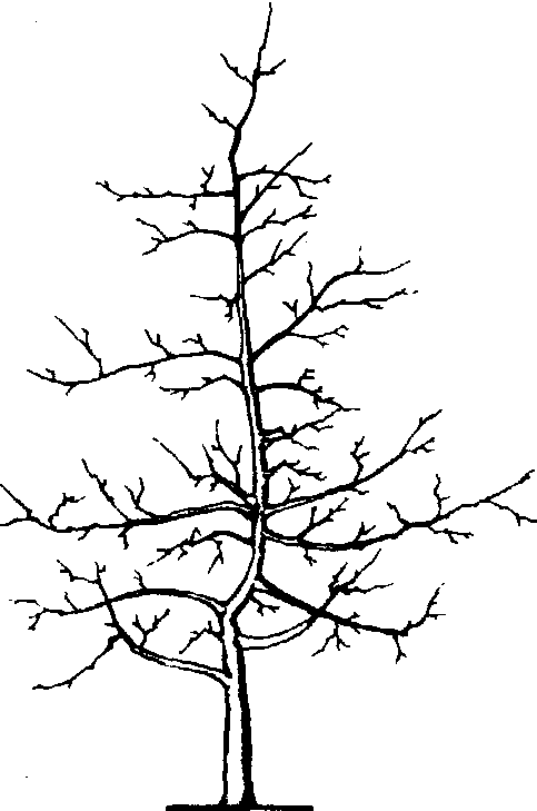 矮化砧主要是引入英国的M和MM系, 多用作中间砧、M9, M26用于矮化栽培。M7、M4, MM106多用于半矮化栽培。 中国的烟台沙果、崂山柰子、陇东海棠(M. kan-svensis Schneid.)、河南海棠(M. honanensis Rehd.)中的一些类型有一定的矮化作用。 栽植 多采用宽行密植。乔砧苹果一般每公顷栽植495~525株,矮化中间砧或短枝型每公顷825~1 500株。以长方形栽植为主, 行距大于株距1~2米。行向南北, 有利于光能作用。偏南部地区秋冬土壤封冻前栽植, 偏北部地区春季解冻时栽植, 在就近育苗条件下可于秋季9月下旬至10月中下旬带叶栽植, 有利成活生长。苹果自花结实力差, 栽植时必须配置授粉树(见品种配置), 并建立透风型林带, 减少霜冻、冰雹等自然灾害(见果园防护林)。 土壤管理 建园前应一次或分期对园地深翻改土,土壤深度在山地不少于60厘米, 建园后, 最好种植绿肥改良土壤, 对碱性土壤施糠醛废渣, 可有效地降低酸碱度。施肥以有机肥为主, 如人粪尿、厩肥、堆肥、饼肥等, 在采收后至落叶前, 作基肥施入, 可以提高果园地力。开花前、定果后、采收前后因树龄、树势和产量分别施氮、磷、钾或复合肥。其N:P2O:K2O的比例为1:0.5:1, 乔砧树一般每生产100千克果实应补给1千克氮素。通过土壤营养诊断和叶分析,参照标准值进行合理施肥。苹果叶各元素标准值范围是氮2.0~2.6%, 磷0.15~0.23%, 钾1.0~2.0%, 钙1.0~2.0%, 镁0.22~0.35%, 锰25~100ppm, 锌15~80ppm, 硼20~60ppm, 铜5~15ppm, 铁150~290ppm(见营养诊断、根外追肥)。高稳产园的土壤有机质含量应达到1%以上。 栽后以及幼树期间地膜覆盖树盘可提高土壤温、湿度, 防止幼树越冬“抽条”, 促进幼树生长发育, 有利早期丰产。 果园除施肥、种绿肥和绿肥翻压外, 应尽量减少耕作以免破坏土壤结构。在水分供应充足条件下, 可以行间种草, 株间用除草剂免耕(见果园土壤改良、果园除草剂)。 5月至6月春梢旺盛生长期需水多,土壤水分应保持在田间最大持水量的80%左右; 花芽分化期需水较少, 应在65%左右; 生长后期保持在70%左右。当土壤水分低于持水量的60%以下,即需灌水。在中国北方应于初冬灌封冻水和春季芽萌动至5月至6月间灌水2~4次, 西北地区和夏季伏旱地区,夏季灌水极重要。有浇水条件的地方, 可以进行喷灌和滴灌。干旱山区和黄土高原区宜在雨后中耕或树盘覆草保墒, 覆草厚20厘米左右,草上稍加盖土以防风, 连年加压, 4~5年耕翻一次, 既可保持水土, 增加土壤肥力, 又可改善土壤结构。亦可采用穴灌, 每树挖宽、深各30厘米的穴5~6个, 穴内灌水, 结合施肥, 并填入绿肥、杂草等有机物, 回填土后, 在穴口覆盖地膜, 既节水又能维持果树正常生长和结果。苹果不耐涝, 雨季必须排除积水, 防止烂根。 整形修剪 最普遍的是主干疏层形, 结构是干高50厘米,主枝5个分为两层, 各主枝着生侧枝2~3个。特点是低干、矮冠, 主枝开张, 树形半圆, 树高是冠径的2/3。半矮化栽培则以中干小冠形较好。 幼树采用冬、夏剪结合, 以整形为主, 轻剪多留,迅速增加枝叶量, 扩大光合面积, 骨干枝利用里芽外蹬为延长枝, 或拉枝开张角度, 并培养多量背后枝和裙枝,作为辅养枝,增加结果部位, 以获早期丰产。随树龄增长,枝叶增加, 生长优势逐渐转为结果优势时,要疏或截辅养枝和裙枝, 培养结果枝组, 保持树势和生长、结果平衡。盛果期后, 适当增加修剪量, 注意更新结果枝组, 维持中等健壮树势,延长旺果期(见果树整形、果树修剪)。 矮化苹果用圆柱形或细纺锤形树形。圆柱形是一个直立主干周围直接配置结果枝组,树体呈圆柱形;细纺锤形(窄圆锥形)也是在一个主干上直接配置永久性结果枝组10~13个, 下部枝组较上部稍大一些, 所有枝组拉成水平,粗度不超过其着生部位的1/2~2/3,树体呈窄圆锥形(图2)。树高2.5米左右,冠径2米左右。以疏为主, 缩疏结合, 永久性枝上生长超过30厘米的直立枝一律疏除, 或在基部有分枝处回缩。 保花保果和疏花疏果 在花果多、气候条件正常条件下, 应疏花疏果; 在气候不良、花少情况下, 应保花保果。保花保果用B9、花期喷硼、花期前后施肥灌水、人工辅助授粉均有效; 疏花疏果多用花前复剪,疏除花芽、花朵或人工疏果, 也有用疏花剂二硝基化合物、石硫合剂, 疏果剂西维因、萘乙酸等, 乙烯利、敌百虫等也有疏果作用。