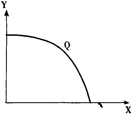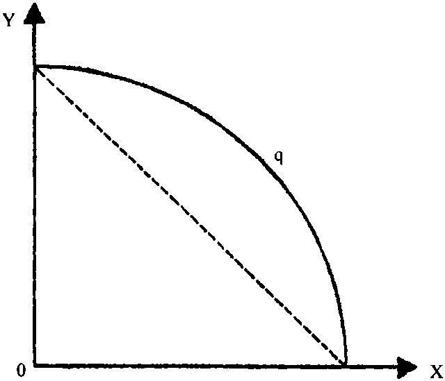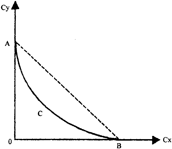 图中曲线表示在技术不变的条件下,使用一定的要素投入可以生产不同数量组合的X、Y两种商品,产品转换曲线凹向原点,则曲线上任意两点的连线上所代表的产出水平低于连线之上的曲线上所代表的产出水平,说明存在着范围经济 (diseeonomies of scope)。如果产品转换曲线是凸的,表明该生产过程为范围不经济,如果产品转换曲线是连接坐标轴交点的直线则表明两种方式产出水平相同,不存在范围经济。范围经济的特征也可以通过研究产品的成本情况加以揭示。如果把上图X、Y两产品的产品转换曲线所揭示的成本特征表示在图形上,则得到下图: 曲线C表示生产X、Y两种产品所耗费的总成本,曲线C与横纵坐标的交点分别表示企业用既定的资源只生产X、Y所耗费的总成本。该成本曲线呈现出与产品转换曲线对偶的特征。当等成本曲线凸向原点时表明存在范围经济。测度范围经济的程度 (degree of economies of scope) 的公式如下: SC= [C (X)+C (Y) -C (X+Y)]/C (X+Y)。其中C (X),C (Y),C (X+Y) 分别表示用既定的资源只生产X,只生产Y和同时生产X、Y两种商品所耗费的成本。反之则存在范围经济,如果SC小于零,则两种情形都不存在。