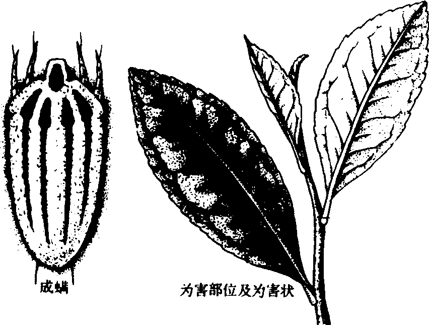 茶跗线螨 生活习性 一年发生代数主要取决于温度。据四川省农业科学院茶叶研究所试验观察, 全世代发育起点温度(发育零点温度)为10.28℃, 有效积温78.27日度;川西茶区名山县年均温15.5℃, 一年发生20代;川东茶区永川县年均温18℃,一年发生30代。卵期1~8天, 幼螨期1~12天, 产卵前期1~6天, 3~18天完成一代。一般栖息嫩叶背面。以两性生殖为主, 雄成螨一生可交尾多次。卵散产于芽尖和嫩叶背面, 每雌螨一般产卵31.7~52.5粒,最多达106粒。当日均温低于10℃时, 即以末代雌成螨于残留新嫩芽叶、芽鳞、叶柄等间隙处越冬。雌成螨经6个月, 翌年日均温升达10℃以上时, 陆续出蛰产卵于茶丛中下部冗生和徒长枝的芽叶上。一般春茶发生数量不多, 夏、秋茶日均温达20℃以上, 虫数激增, 繁殖1代仅需3~8天, 进入为害盛期。其传播除人为携带外, 季风有助其蔓延扩散。 防治 预测始盛期, 及时组织防治, 根据当地气象资料有效积温达235日度左右或年均温15℃左右茶区,始盛期一般在5月下旬,18℃左右茶区一般在5月中旬。当茶园有螨芽叶率在10%以下为为害初期, 向后加30天为始盛期。始盛期前采净或剪净茶丛内新嫩芽叶,喷施50%代森铵500倍液40%亚胺硫磷、50%辛硫磷1000倍液。以后根据茶园调查, 当平均每叶螨卵数达10个以上时再喷药防治。越冬前当日均温近10℃时,除净茶园杂草, 剪净或采净残留的新嫩芽叶后,喷洒波美0.5~1.0度石硫合剂。 |