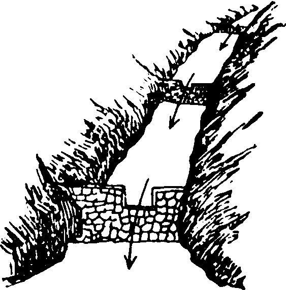 图2 等高隔离沟开垦法 灌溉系统 可分茶园流灌与喷灌两种, 应分别进行设计。流灌系统主要由主输水渠, 支输水渠,纵沟,横沟等组成。主输水渠的作用主要为承接机埠抽出或横排水沟进水。 自流水源而来的水输送至各支输水道。其断面设计依流量而定, 主输水渠宜设置在各个区茶园的较高处, 一般可与设在山上分水岭或山腰的主道, 支道并行, 以便分送水流进入各片茶园的支输水渠。支输水渠的作用主要为承接主输水渠之水进入园沟之用。其断面设计应依分水流量及地形特点而定。支输水渠宜设在各片茶园的上面较高处, 一般可与各山头山背上的主要园道并行, 以便分送水流进入园内纵沟。纵沟也可做成阶梯式, 以利灌溉。越过园道时, 应以涵管相接,以便操作和机械行走, 园内纵沟沟底较横水沟应略低,沟沿略高10~15厘米。横沟为接纳园内纵输水沟的水最后进入茶行, 达到流灌的目的。横沟一般不另行设置, 即利用茶园排水系统的但茶园地块较大,茶行较多, 则应加设临时横沟进行流灌(图3)。
