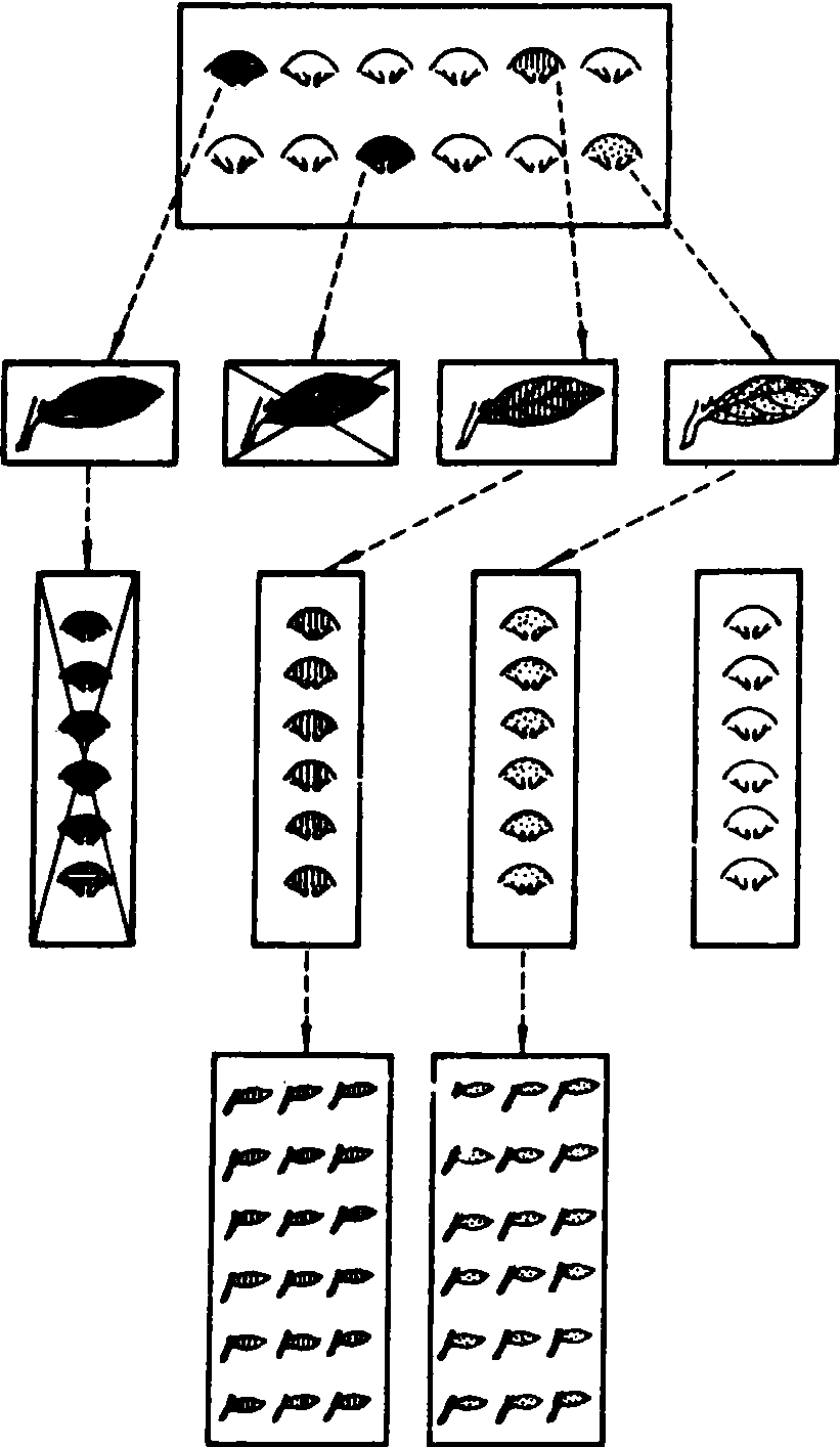 茶树单株选择图式由上至下:1.第1年从原始群体中选择优良植株2. 第2~3年分株初步繁殖, 并继续鉴定入选单株3. 第3~10年比较试验 (右第1行为对照品种),同时进行区域性试验 4. 第10年以后良种繁殖推广 |