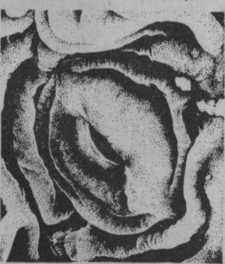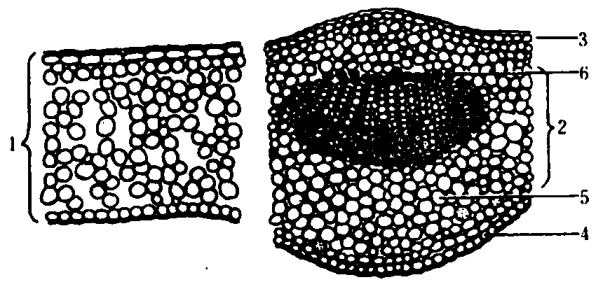 图5 茶树叶片的叶内细胞(电镜5400倍) 对夹叶 茶树营养芽所分化的叶原基并没有完全发育为叶片, 过早地停止了生长而形成为驻芽, 称之为对夹叶,又叫对口叶、马口叶、对片叶、摊片、堆片。指的是新梢顶端“驻芽”邻近的、节间短、状似对生状态的两张叶片。驻芽出现后, 新梢的伸长就明显缓慢下来, 这种不正常的新梢一般只有2~3张叶片。 鱼叶 茶树新梢每次生长的头一片或几片的叶。叶色较淡, 厚而硬脆, 叶柄宽而扁平,侧脉隐而不显,叶缘为全缘或前端有锯齿,叶尖圆钝, 叶面积小于真叶。鱼叶是区分春梢、夏梢的标志, 鱼叶的解剖结构常见的是分化不完全,与一般叶片有显著不同(图6),主要是栅栏细胞与海绵细胞没有多大区别, 叶绿体甚少, 整个维管束小, 薄壁细胞占据主脉的大部分, 维管束的部位偏向于上表皮,仅出现少量的机械组织。鱼叶的发育不完全, 采茶时不要采摘,否则制成的毛茶,品质低下。