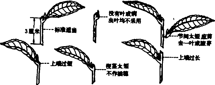 图4 根插 插穗剪取 从插条上剪取插穗的过程称为插穗剪取。当剪穗茶树的留养枝茎秆已半木质化、一般品种的枝条大部分已成红棕色、上部青枝条已硬化、中部腋芽有米粒大并且叶片已成熟的,便从鱼叶上留一、二片叶处剪取插条,剪取插穗以插条中部数节为最好,它们成熟度适中, 腋芽饱满,叶片大且营养物质贮藏多,较上、下部各节剪取的插穗发根抽芽快。剪取插穗时,通常从枝条的下端开始依次向上剪。普通的一叶短穗是剪下带有一个腋芽、一张完整健康叶片和一段短茎,长3~4厘米; 一般一个节间剪一短穗, 节间短的可剪一穗,将下端的叶片和腋芽剪去。剪口要与叶向相同,最好为斜面,上下端切口呈平行。插穗下端切口倾斜,增大接触面而易与土壤贴紧。插条上的腋芽已长成小枝的, 剪穗时将主枝留一叶, 小枝留基部的一片真叶进行剪取。剪口须平滑(图5)。剪穗时将花蕾摘除。最好在清晨及傍晚时随剪随插, 或在白天剪穗而在傍晚扦插。如不能立即扦插、可将剪好的插穗放在茶篮等器具里或摊放在荫湿的地上,避免风吹日晒和紧压,保持新鲜状态。贮放期间, 经常喷水并适时翻动, 以防因插穗的切口蒸发的水分大而影响扦插成活。在他地扦插, 用竹篓或炭篓把剪下的插条进行包装, 运输到达后, 再进行剪穗扦插。插条在运输途中, 喷水勿紧压, 力求维持插条的新鲜状态。在剪穗前3~5天用50ppm的2,4-D或30 ppm的增产灵等植物生长激素喷洒养穗母树, 使枝叶充分湿透,能促进插穗发根,提高成活率, 有利茶苗健壮生长。