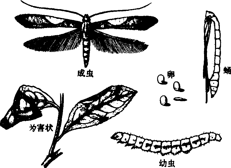 茶细蛾 生活习性 在浙江一年发生7~8代, 以蛹在茶叶背面越冬, 各代幼虫为害期分别在4月上旬至5月上旬、5月下旬至6月中旬、6月下旬至7月上旬、7月中旬至8月上旬、8月中旬至9月上旬、9月中旬至10月中旬、10月下旬至11月下旬。气候对其发生影响较大, 全年以6月前后第二、三代发生最重, 夏季因高温干旱虫口明显下降: 秋季气温下降雨量增多后又逐渐回升, 10~11月间亦有相当为害。成虫有趋光性,停息时侧面观呈“入”字形。卵散产于嫩叶背面。幼虫为害按其习性可分为三个阶段: ❶1、2龄为潜叶期, 幼虫潜入叶内取食叶肉危害, 叶背出现弯曲带状灰白色潜痕; ❷3龄和4龄前期为卷边期, 幼虫在叶内吐丝将部分叶缘向背面卷折, 虫体藏于卷边内取食叶肉; ❸4龄后期和5龄为卷苞期, 幼虫从卷边中咬一孔洞爬出, 吐丝将叶尖向叶背卷结成三角形虫苞, 栖息于苞内取食危害。老熟后从三角苞内穿孔爬出, 移至下方叶背面吐丝结茧化蛹。 防治 结合采摘除幼虫。喷施90%巴丹1000~1500倍液或10%二氯苯醚菊酯,2.5%溴氰菊酯, 20%杀灭菊酯6000~8000倍液, 25%喹硫磷1000倍液, 50%辛硫磷或80%敌敌畏800~1000倍液,喷药需在卷苞前进行, 尤以潜叶期效果最好; 幼虫期以锥腹姬小蜂寄生较多, 应加以保护。 茶细蛾tea leaf rollerCaloptilia theivora Walsing-ham,鳞翅目,细蛾科。日本、印度、斯里兰卡和中国各茶区均有分布。成虫翅展10~13 mm,体暗褐,前翅具紫色光泽,近中央有一金黄色三角形斑,后翅缘毛长。末龄幼虫体长8~10 mm,乳白至黄白色,腹足4对。年发生7~8代,以蛹茧在叶背越冬。成虫有趋光性,停息时虫体竖立。卵散产于嫩叶背面。幼虫1、2龄潜食叶肉,3、4龄吐丝卷缀叶缘藏身,4~5龄自叶尖反卷成三角苞居中为害。可结合采茶摘除幼虫;幼龄期喷药防治。 |