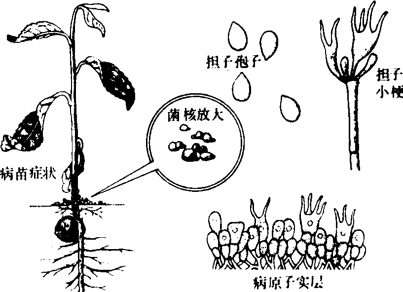 茶苗白绢病 1.担子孢子 2. 担子小梗 3. 病原子实层 4. 病核放大 5. 病苗症状 |
