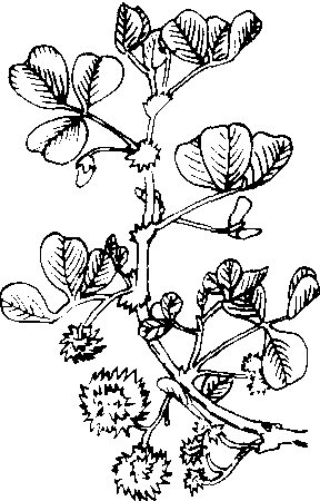 菜苜蓿California burcloverMedicago hispida Gaerth.,又称草头、金花菜、黄花苜蓿、南苜蓿、刺苜蓿。豆科,苜蓿属。一二年生草本。2n=2x=14。原产印度。中国南方栽培较多。茎匍匐或开展。三出复叶,小叶宽,倒卵形,先端钝圆或稍凹,叶缘上部锯齿状,叶表浓绿,背面稍带白色,托叶细裂。总状花序,腋生,每一花序有黄色小花2~6朵,蝶形花冠。荚果螺旋形,有钩状刺,种子肾形,黄褐色。耐寒,对土壤适应性强。春秋两季都可栽培。撒播或条播。两片真叶后灌水施肥,每收割 一次,施一次肥。留种田宜秋播,防寒越冬,翌年夏季收种子。主要绿肥作物,嫩茎叶可炒食、腌渍。