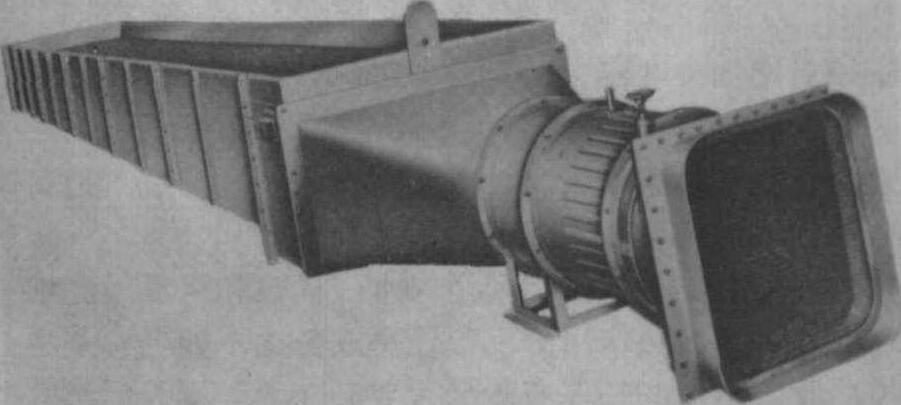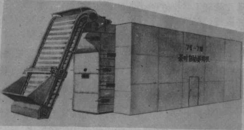 图2 115型红茶萎凋槽 大型厚层萎凋槽及正逆向可控萎凋室 应用于肯尼亚等新兴红茶生产国。它的萎凋室两侧墙壁上设百页窗式可启闭的进、出风门, 室内设空中轨道, 茶叶由轨道送入室内,倒入宽2米, 长20~25米的槽面上,叶层摊放厚度可达40~80厘米, 采用送风和吸风交换作业的通风方式, 墙上百页窗也随之启闭, 并有大型多翼轴流风机, 可正反转。这种方式使较厚茶叶层的上下萎凋均匀, 并可节省厂房面积。 多层萎凋机组 1982年浙江绍兴市茶场研制出6CW-60型三层叠装联动萎凋机组, 整套机组由刮板式上叶输送机、斗式循环链输送机、10台三层联动萎凋机、振动槽出叶输送机及锅炉等组成, 整套机组每日可萎凋鲜叶5万千克, 仅需5~6人操作, 1983年投产使用。 |