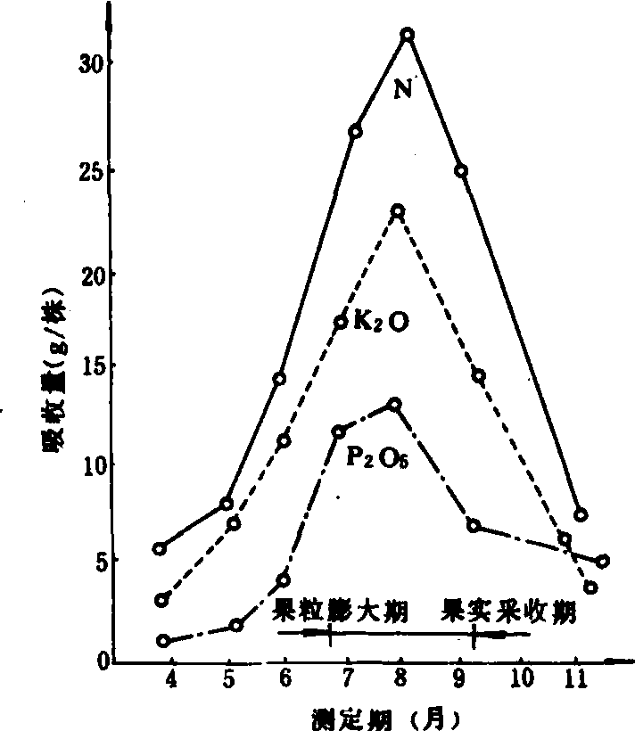 葡萄施肥fertilization on grape yard根据葡萄植株生长发育过程中对养分的需求,结合土壤供肥特性和肥料效应而采取的施肥技术。 需肥特性 葡萄是适应性很强的树种,世界各地的贫瘠山地、盐碱沙荒地以及肥水条件好的平原地区均有栽培。葡萄结果早,一般定植后第二年即有产量,4年进入丰产期。葡萄产量每公顷可达60~90吨,为保证连年高产、稳产和优质,必须及时而充分地供应大量生长的新梢、叶片、浆果和根系所需的各种营养物质。葡萄在年生长周期中,浆果生长之前对氮(N)、磷(P)、钾(K)三要素的需要量较大,主要用于萌芽、新梢生长与开花坐果。本期氮素的来源主要是根系和枝蔓中贮藏态的氮如精氨酸、脯氨酸和谷氨酸等。葡萄植株吸收三要素量最大的时期是果粒膨大至果实采收期(图),这与此期植株叶面积大、果实消耗量大以及根系新根量大有关。植株的贮藏营养对春季萌芽整齐、新梢旺盛生长、开花正常而有较高的坐果率等有良好影响,所以幼果膨大之前,施入氮肥能显著地提高产量。但过量或单一的氮肥则明显降低浆果品质,如着色差、含糖量低、成熟延迟等。在生长后期氮过多,不利于新梢成熟,减少枝蔓上饱满芽的枝段长度,降低枝蔓和芽的越冬能力。葡萄根系主要吸收硝态氮,吸收后大量地积累于叶柄和穗轴中,浓度为100~1000毫克/千克,开花期叶柄中NO3-—N水平最高,达到1000~1500毫克/千克,可以保证浆果产量。葡萄贮藏组织中精氨酸含量、成熟浆果的精氨酸和脯氨酸含量、秋季至早春一年生枝蔓中的谷氨酸含量,均可作为植株氮素水平的可靠指标。磷与钾在葡萄生长发育的任何时期都是必需的,与氮比较,生长后期需要量与吸收量更大些。磷素对葡萄开花、授粉与坐果都有正相关效应,施以适量的磷肥能增大叶片,改善叶光合功能,有利于花芽分化以及新根的发生,增加穗重和粒重,还提高浆果中可溶性固形物含量及果汁与果酒的风味品质。生长后期供磷充足可增强叶片、枝蔓的抗病能力,促进枝蔓成熟。葡萄植株对钾的需要量也大(表1)。浆果成熟过程中灰分中钾占阳离子总量的81.5%;在幼果期枝蔓组织液中氮浓度在高峰值,此时组织液中N:P2O5:K2O=1:0.17:10,是山葡萄植株良好营养状况的标志。葡萄根系和叶片对钾素的吸收,一般土壤中以氯化钾为好,硝酸钾效果较差;盐渍化土壤中吸收氯化钾和石灰性土壤中吸收硝酸钾效果均差。根外追施钾,1小时后即可被幼叶吸收。幼叶吸收钾,能明显地促进根系对磷的吸收。葡萄植株缺钾后果穗小而紧实,果粒小,成熟不一致,果汁与酒的品质低劣。但供钾过多也不好,尤其对那些制干红葡萄酒的品种,会出现“酒过量”现象,酒的pH值升高,品质显著下降。铁(Fe)对葡萄生育有重要作用,导致植株缺铁而失绿的原因复杂,它不但与土壤中有效铁含量有关而且与叶片的全铁、1摩尔/升盐酸中可溶性铁以及叶脉间细胞汁液中钙(Ca)、磷的含量有关(表2)。土壤中一般不缺钙,加上葡萄园常喷施含石灰的波尔多液,所以葡萄缺钙问题并不突出,只是酸性土壤上的葡萄园应施石灰,既调节土壤理化性状,又改善植株的钙营养状况。葡萄缺钙时,新梢枯尖,叶片皱缩,浆果畸形而极易感病。葡萄缺硼(B)现象十分普遍(表3)。在心土有胶泥层、生长季节严重干旱或长时间积水的葡萄园,缺硼现象更为严重。有缺硼症状的植株,尤其是衰弱植株,第二年春季萌芽迟缓,多项物候期不整齐和紊乱,严重时甚至整株死亡。和其他果树一样,葡萄缺锌(Zn)时也易出现小叶病。尤其是白色浆果的品种对缺锌更为敏感,即使新梢初生长时的小叶病症状被新梢旺长所掩盖,也避免不了严重的落花落果,进而影响到果汁或果酒的质量。微量元素中钼(Mo)、锰(Mn)等对葡萄有较特殊的功效。钼提高叶片重量;钼、锰都能使单叶重增加,提高叶绿素含量使叶片的光合效率增强从而增加坐果量,并改进浆果品质,提高产量。葡萄花前和浆果成熟初期施这几种微肥显著地改进浆果品质,提高含糖量。锌、锰还能提高浆果中维生素C含量,使葡萄穗各部位的浆果粒成熟一致,这对一些红色鲜食品种很有意义。另外,锌与锰使叶片和枝蔓中水的含量增加,尤其束缚水的含量增加,从而大大提高了植株一系列的生理生化过程强度,提高了植株抗逆能力,突出表现在早春枝蔓上枯死芽减少,花序展开后落蕾减少。
