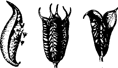 蓇葖果 1.马利筋的蓇葖果 2.耧斗菜的蓇葖果 3. 飞燕草的蓇葖果 |
