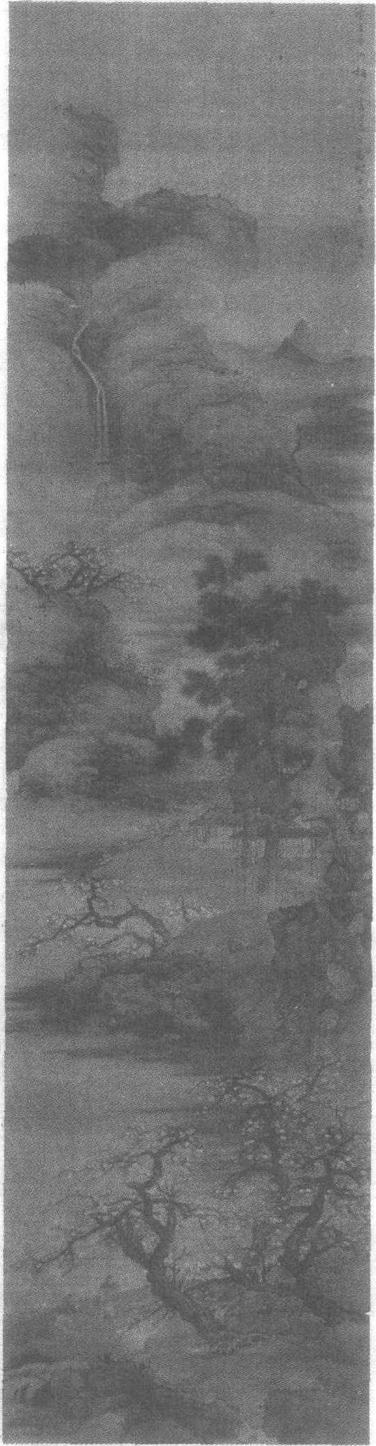 清。蓝孟绘。绢本设色。纵181厘米,横47.1厘米。浙江省博物馆藏。蓝孟见《蓝孟秋林逸居图轴》条目。此图描绘的是梅花盛开季节,梅花书屋周围的景色。画面左侧取水塘局部,坡岸迂回,近水处几间简朴的书屋隐现。假山兀立,老梅枝茎虬盘,花朵顾盼生姿。一老者策杖徜徉于梅林中,书僮抱琴紧随。远处高山圆浑,飞瀑如练,雾霭氤氲。作者的笔墨、设色,师法其父蓝瑛。坡地用石绿画成一假山敷以石青;梅花的设色最为细致,以淡墨衬染后用铅粉点簇。不同的色彩和笔墨丰富了景致的内涵,在师法前辈的基础上颇具自己的风格。