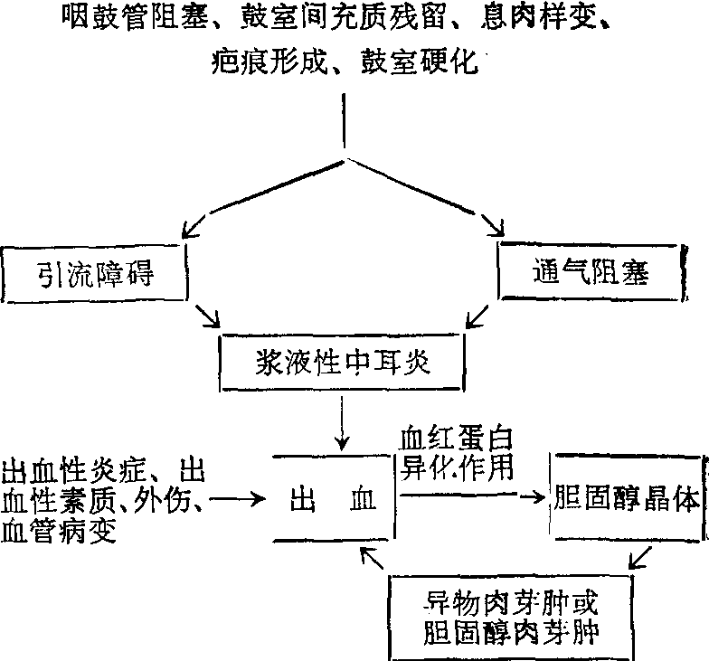 胆固醇晶体可刺激组织致发肉芽肿,已经动物试验证实,用灭菌的胆固醇混悬液注入豚鼠鼓泡内,日后可形成这种肉芽肿。胆固醇肉芽肿一经形成后,常有少量出血,又可致发肉芽肿,成为恶性循环。 据文献报告乳突手术所见,病变的程度不一,包括乳突气房内积液、骨隔坏死及肉芽组织。积液多为稠厚胶状,呈棕、棕褐、暗绿或黑色不等。骨部破坏程度不一,有广泛骨破坏的报告。肉芽肿可发生于乳突部、鼓窦、上鼓室及中鼓室。肉芽肿多为棕色,偶为暗绿色,有发亮点。显微镜观察可见胆固醇肉芽肿为由含血管较多的结缔组织所组成,其间可见许多已溶解的胆固醇晶体菱形空隙,周围有多核巨细胞或巨噬细胞,其中血管易于破裂,故同时可见到新鲜和陈旧性出血。