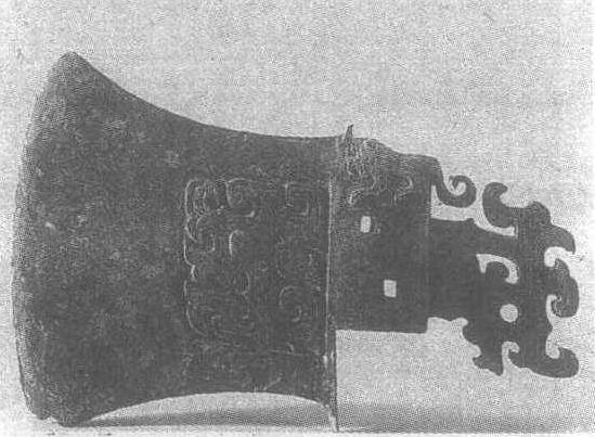 | 释义 | 虎纹铜钺 虎纹铜钺商。通长24.2厘米,宽23厘米。1971年征集。湖南省博物馆藏。钺是古代一种兵器,但至商代晚期,实际上已失去了实用的价值,而成为象征权力的一种礼仪性的武器。此钺刃呈弧形。銎顶端饰一虎,形态生动。器之两面靠近銎的援正中饰兽面纹。这种有銎钺与中原地区出土的商代晚期平肩方内厚重的铜钺,具有地方特色。