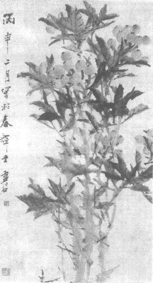 清。虚谷(见《虚谷紫藤金鱼图轴》条目)绘。纸本设色。纵129.8厘米,横72.1厘米。江苏省南京博物院藏。此幅自题款书:“丙申二月写于春辉堂,虚谷。”丙申为光绪二十二年(公元1896年),同年虚谷以74岁谢世,是虚谷的最后作品之一。画面上枇杷数枝,枝干挺直,顶天立地。枝、叶、果实均峥峥向上,满纸蓬勃生气。枇杷用没骨画法,以赭石做底色,成熟者点以朱膘色,生者加汁绿。枝干和叶子用水墨画法,叶筋处以重墨稍勾,墨色层次丰富,成熟的果实与几片浓重的叶子在色彩上互相呼应。淡彩焦墨,设色冷隽。空寥的背景更加衬托了枇杷树的气势,静穆之中蕴含着无限生机。茂密的枝叶、累累的果实,精神饱满,骨气凛然,似在颂扬画家辉煌的人生、艺术的意境。在构图,色彩和笔墨技巧上都达到了炉火纯青的境界。