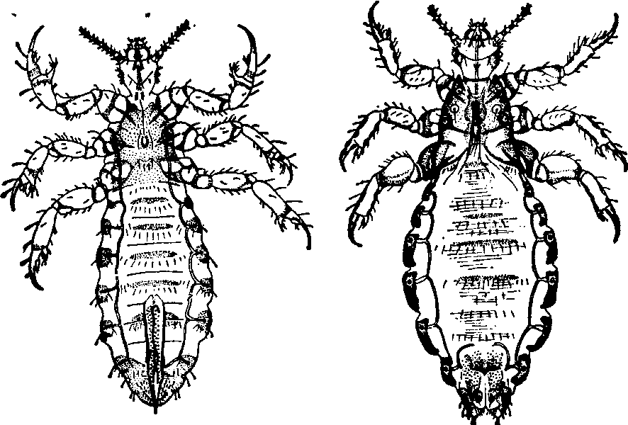 人体虱 人体虱主要寄居在衣服的皱缝内,卵粘附在衣服的纤维上,尤以内衣裤为多。人头虱寄居在发丛中,卵粘附在发上,以耳后部为多。稚虫及雌、雄成虫均吸人血,常边吸血边排粪。人虱寄居场所的适宜温度为29~32℃。当人发热或死亡后,虱则离开人体。这种习性与疾病传播有关。 人虱能传播流行性斑疹伤寒、战壕热及回归热。此外,地方性斑疹伤寒由蚤传到人后,也能由人虱传播。 耻阴虱 (Phthirus pubis Linn.,1758) 属于阴虱科,阴虱属,体型宽短似蟹,体色灰白。雌虫长1.5~2mm,雄虱稍小。耻阴虱的形态似人虱,但其胸部和腹部均较宽短,两侧有疣状突出。前足及其爪均细;中、后足及其爪均粗大。耻阴虱主要寄生在阴毛和肛门四周的毛上,也能在眉毛、睫毛、须发、腋毛等处查见,可引起局部搔痒。该虱能否传播疾病尚不明确。 ☚ 蚤 臭虫 ☛ 虱[蝨]shī (虱子) louse 虱louse 虱louse 虱shīlouse (pl. lice);pediculus (pl.pediculi) 虱shī