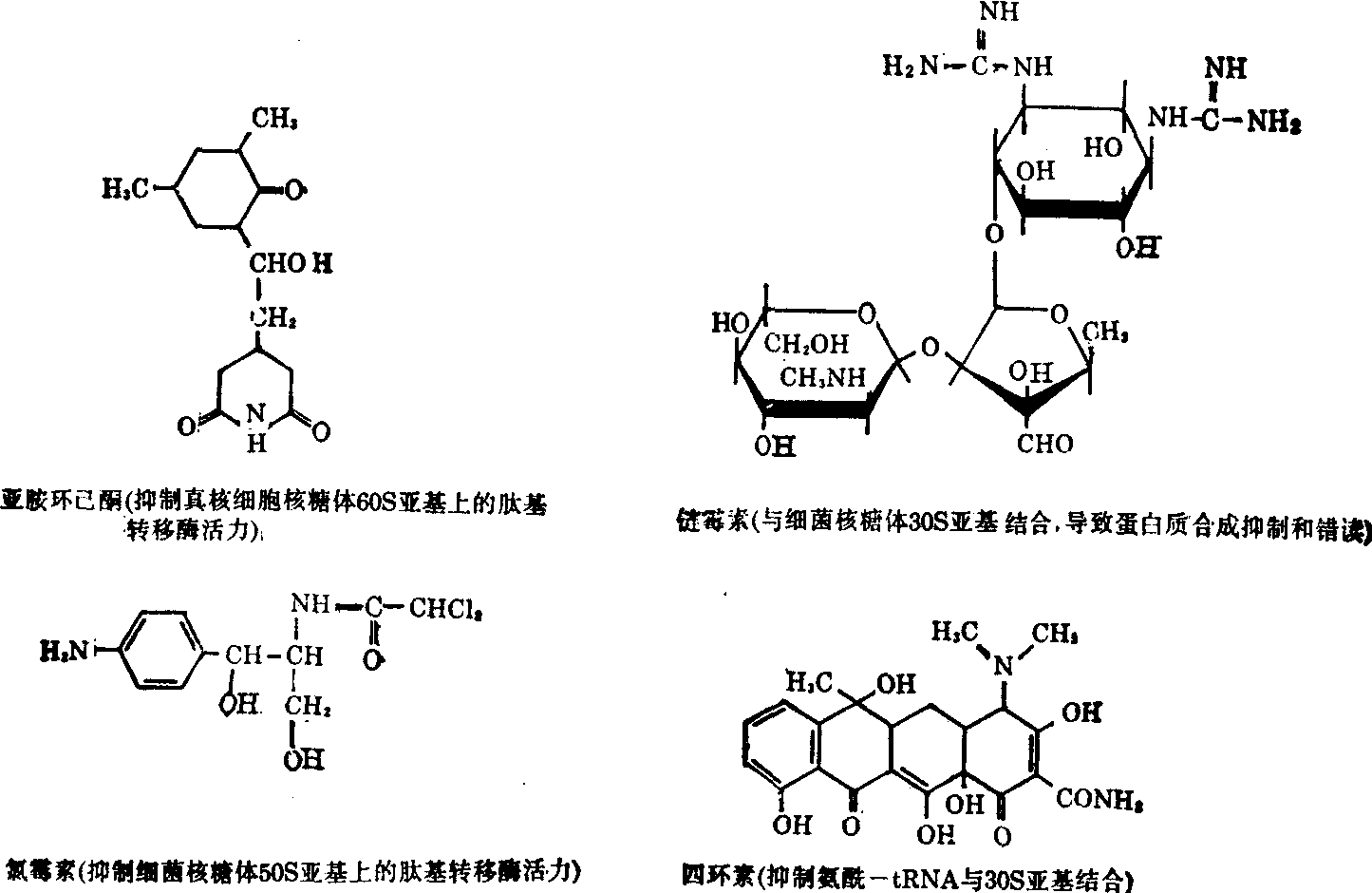 氯霉素能抑制原核细胞70S核糖体上蛋白质合成,其作用环节是阻断肽基转移反应。它同样能抑制真核细胞的线粒体70S核糖体的蛋白质合成,但对细胞质的80S核糖体不起作用。氯霉素临床使用时的副作用就是由于对人体细胞的线粒体70S核糖体的蛋白质合成,但对细胞的80S核糖体不起作用。氯霉素临床使用时的副作用是对人体细胞的线粒体也有影响。另一方面,亚胺环己酮 (gycloheximide)则能抑制真核细胞80S核糖体的蛋白质合成,而对原核细胞70S核糖体没有影响。亚胺环己酮的作用是阻断肽键的形成。同样地,抑制细菌70 S核糖体功能的抗生素对叶绿体的核糖体也有抑制作用,而抑制真核细胞细胞质80 S核糖体功能的抗生素对叶绿体则没有影响。因此,可以利用这两类抗生素来研究真核细胞的细胞核和这两种细胞器在蛋白质合成的遗传控制上的互补关系。