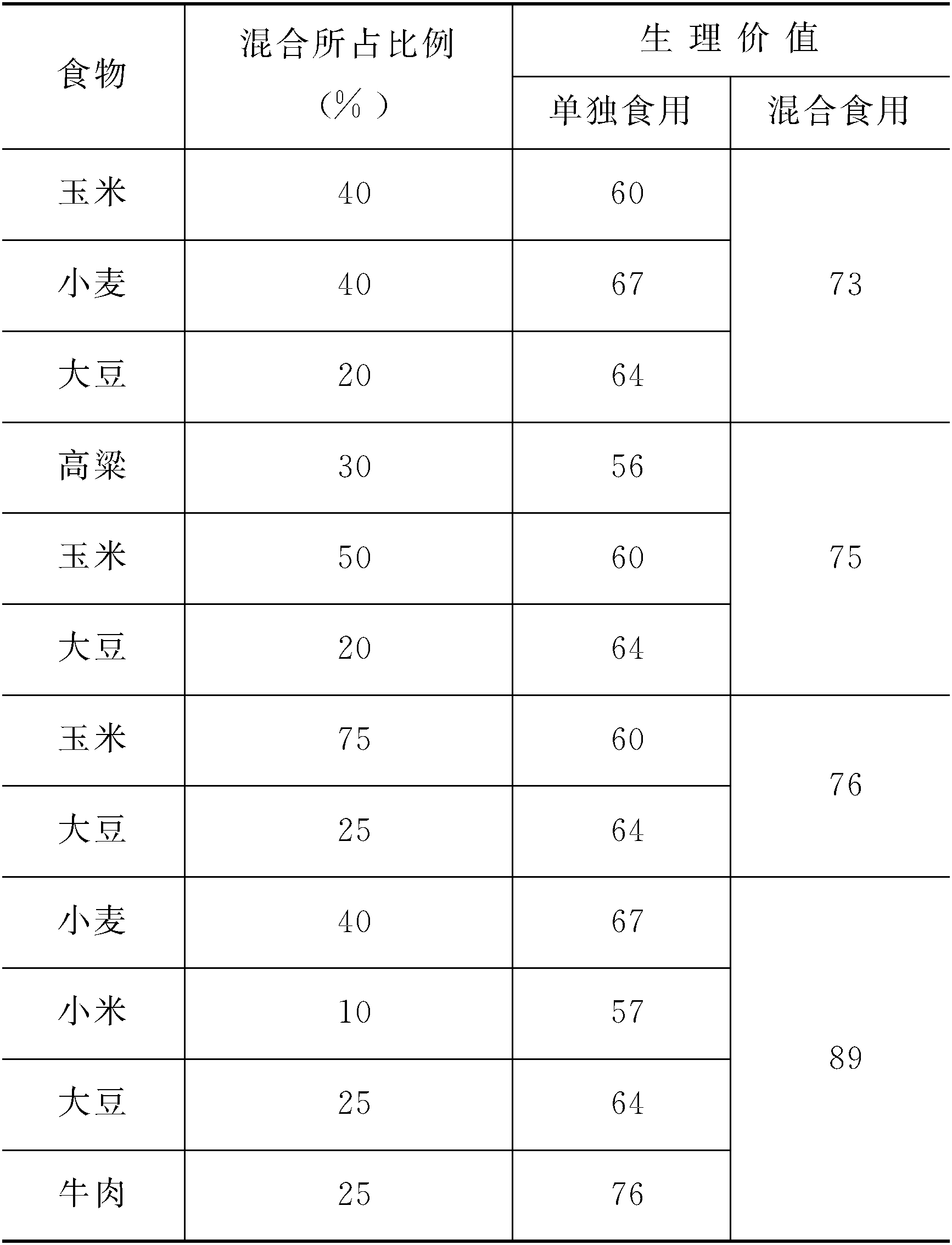 蛋白质的互补作用 蛋白质的互补作用danbaizhi de hubuzuoyong一种营养价值较低的食物蛋白质,与他种食物蛋白质混合食用,则可互相取长补短,大大提高混合蛋白质的利用率,这种作用称蛋白质互补作用。例如粮豆混吃,粮食缺少赖氨酸,豆类缺少蛋氨酸,混吃则可互补。如在粮豆之外,再补充适量的动物蛋白质,则效果更为显著。大米、小豆粥,豆腐脑加芝麻酱(芝麻含蛋氨酸较多,缺少赖氨酸,黄豆则相反),都是可提高混合食品营养价值的实例。 几种食物混合前后蛋白质的生物学价值