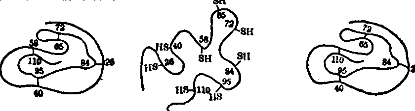 一般认为,如果引起变性的因素比较温和或在变性的初期,蛋白质分子的构象尚未受深度破坏,则一旦引起变性的因素解除后,仍能使蛋白质空间结构和原有的性质与功能一概恢复原状,亦即变性作用是可逆的。例如,核糖核酸酶用尿素及β巯基乙醇处理后,—S—S—键还原成—SH,氢键受破坏,肽链松散,核糖核酸酶即失去催化功能,成为变性蛋白质。但是,经透析除去尿素与β巯基乙醇以后,—SH基又缓慢地重新氧化成—S—S键,氢键又逐渐形成,因而恢复了原来的空间结构,随之也恢复了酶的功能(图),称为蛋白质复性。然而较强烈的处理往往使蛋白质的变性成为不可逆。例如,受强酸、强碱、加热等处理而变性的蛋白质溶解度降低,生物活性完全丧失。