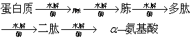 蛋白质在碱性、酸性或酶存在下均可发生水解反应。单纯蛋白质的水解产物均为氨基酸,结合蛋白质的水解产物除氨基酸外; 还有其他物质。蛋白质在酶的作用下水解过程十分复杂,可得到一系列的中间产物,大体过程如下: