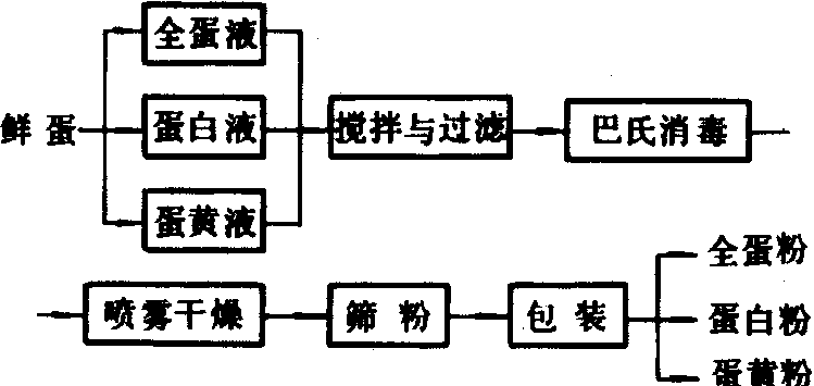 | 释义 | 蛋粉加工egg powder processing采用干燥法将鲜蛋蛋液加工成粉状制品的过程。蛋粉加工采用的原料是鲜鸡蛋,其制品有全蛋粉、蛋白粉、蛋黄粉三种,工艺流程如下: