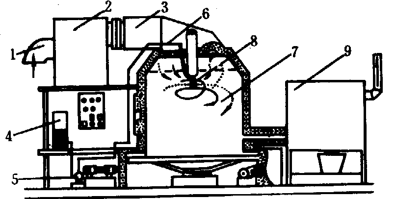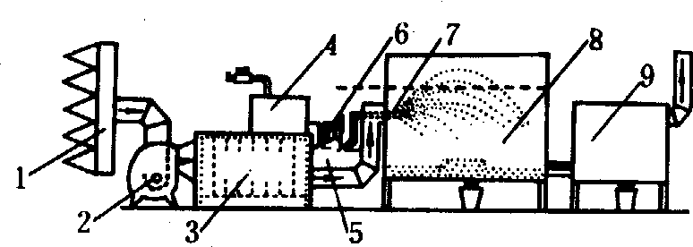 图2 离心式喷雾干燥示意 1.空气吸入口; 2.空气过滤器; 3.加热器; 4.贮蛋液罐; 5.蛋液输送器; 6.导管; 7.干燥室; 8.离心喷雾盘; 9.沉降器 |