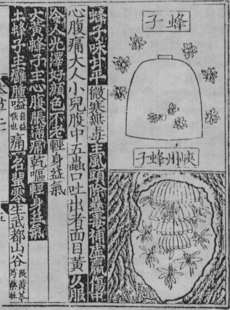 《重修政和经史证类备用本草》书影 蜂体 指入药用蜜蜂全虫。中国民间流传着蜜蜂内服或外用治疗风湿病、妇科病、软骨病、佝偻病、哮喘和支气管炎等的验方。明代医籍《赤水玄珠》 (1584年刊行)载蜜蜂配方治疗淋巴腺结核。蜜蜂经文火焙干粉碎后装入布袋,封口。将此袋置风湿痛区或妇科病患者小腹部,将青砖烧红浸水后乘热压在袋上,用小沙袋固定、棉毯包裹熨疗30~60分钟,每日1次,10~15次为一疗程。在顺势疗法(homeotherapy,又称同类疗法)中,使用蜜蜂滴剂、丸药和软膏治病。百余年来,所有顺势疗法的书籍都推荐使用蜜蜂来医治多种疾病。 由民间蜂整治病经验与中国针灸医术相结合发展而成的蜂针疗法,使用活蜂螫针作针具刺激经络皮部和穴位,提高了原始蜂螫法的疗效。 人们在露天蜂场,呼吸充满蜜蜡、蜂胶和百花芳香的新鲜空气,享用新鲜的多种蜂产品,也有助于某些体弱病者的康复。有关医疗休养机构建立起康复养蜂场,以使老人、残疾者从养蜂活动中寻找乐趣,有助于健康长寿。康复养蜂场的各种产品——蜂蜜、蜂花粉、蜂胶、蜂毒、蜂王浆、蜂蜡、蜂巢、蜂子和蜜蜂可充分地用于医疗保健。对于关节病、高血压、神经官能症以及病后、手术后和身体虚弱的人,从事养蜂活动更是一种有效的“工娱疗法”。蜂疗melissotherapy系指蜂及其相关物治疗疾病而言。蜂蜜、蜂王浆、蜂花粉、蜂蛹含有多种营养成分、酶类及活性物质,有增强体质、改善生理功能的作用;蜂王幼虫含有生育酚、性激素,有调节性功能及生育功能;蜂窝治疗鼻炎及产后妇科病;蜂胶治疗皮肤病、肠炎、降血脂、口腔溃疡;蜂毒用于抗炎、抑菌、抗心律失常等。 |