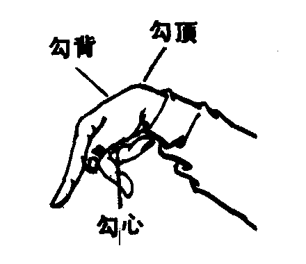 螳螂拳手型。将拇指、食指、中指轻轻合起,小指、无名指收拢,手腕弯屈。
